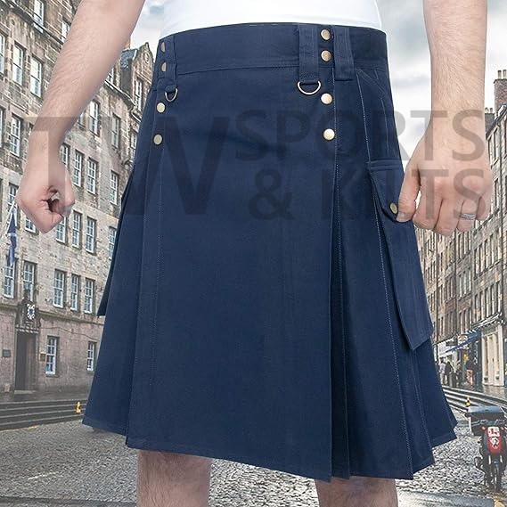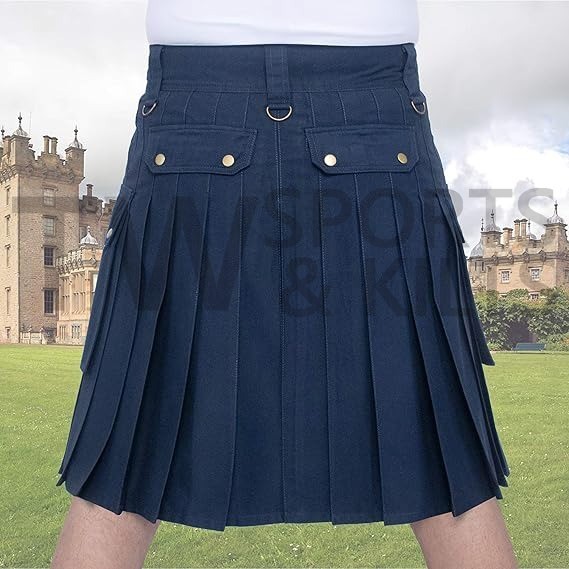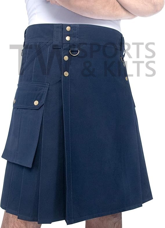 Men's Blue Utility Kilt Made Of Cotton With Two Side Pocket Two Back Pocket