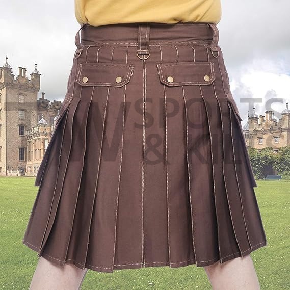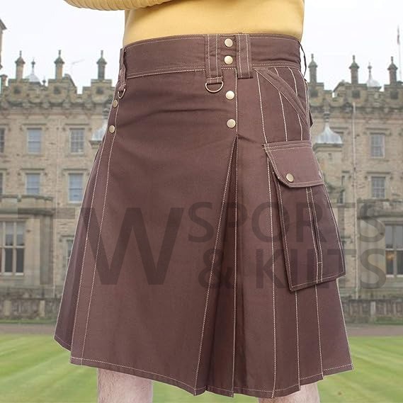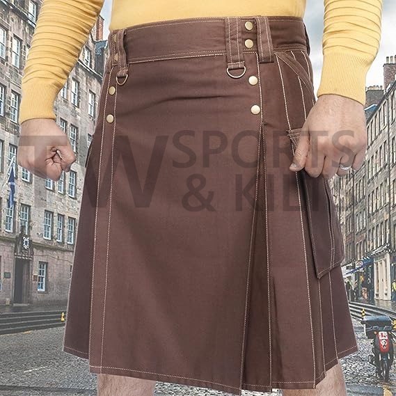 Men's Brown Utility Kilt Made Of Cotton With Two Side Pocket Two Back Pocket