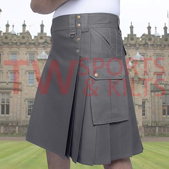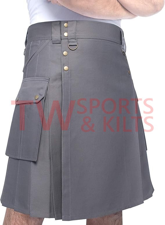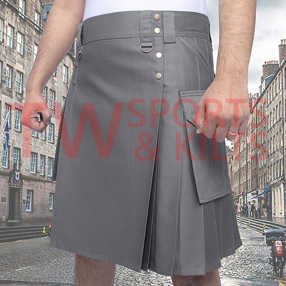 Men's Grey Utility Kilt Made Of Cotton With Two Side Pocket Two Back Pocket