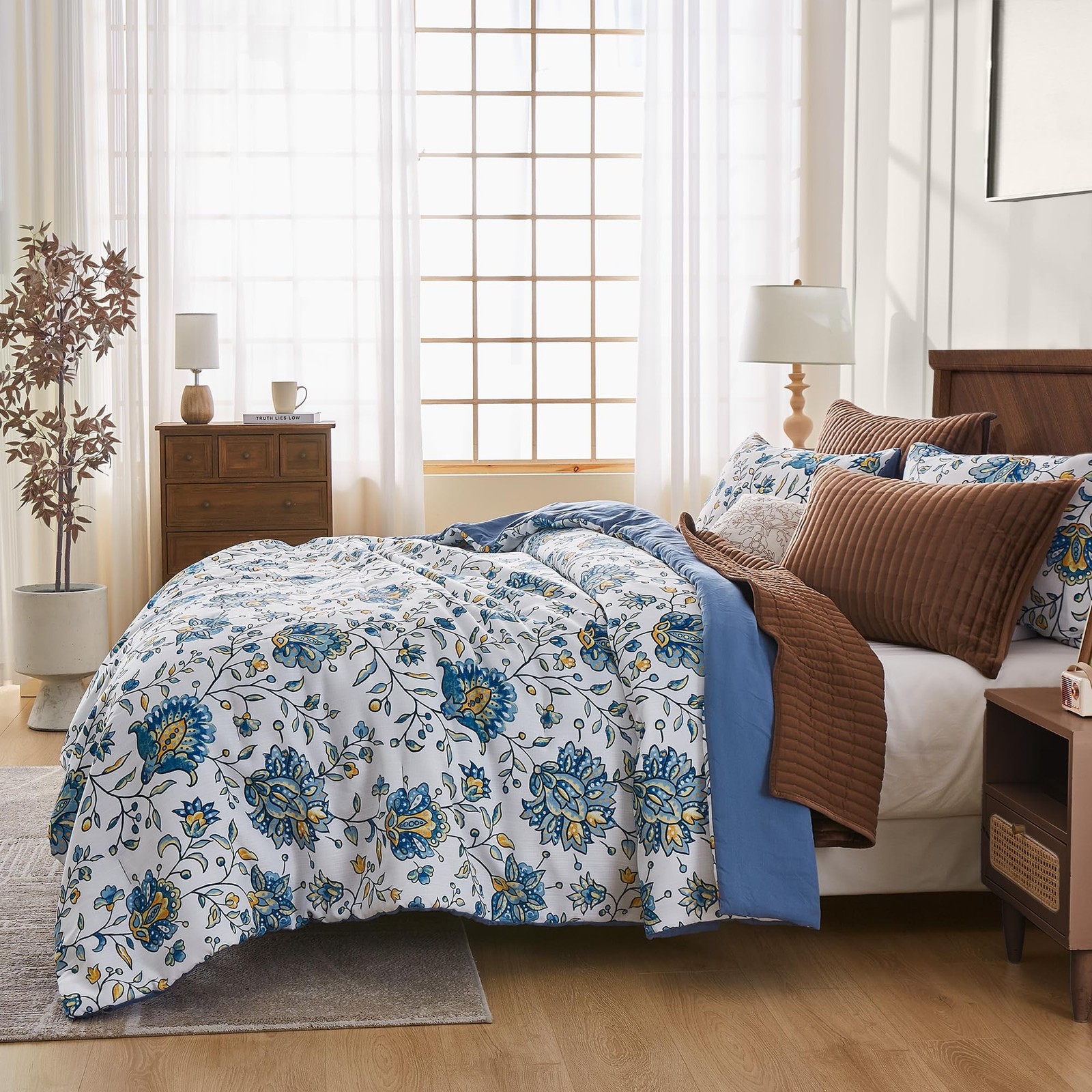 Wonderful Blue Iris Floral Comforter Set Queen Size, Linen-Like Bedding Sets ...