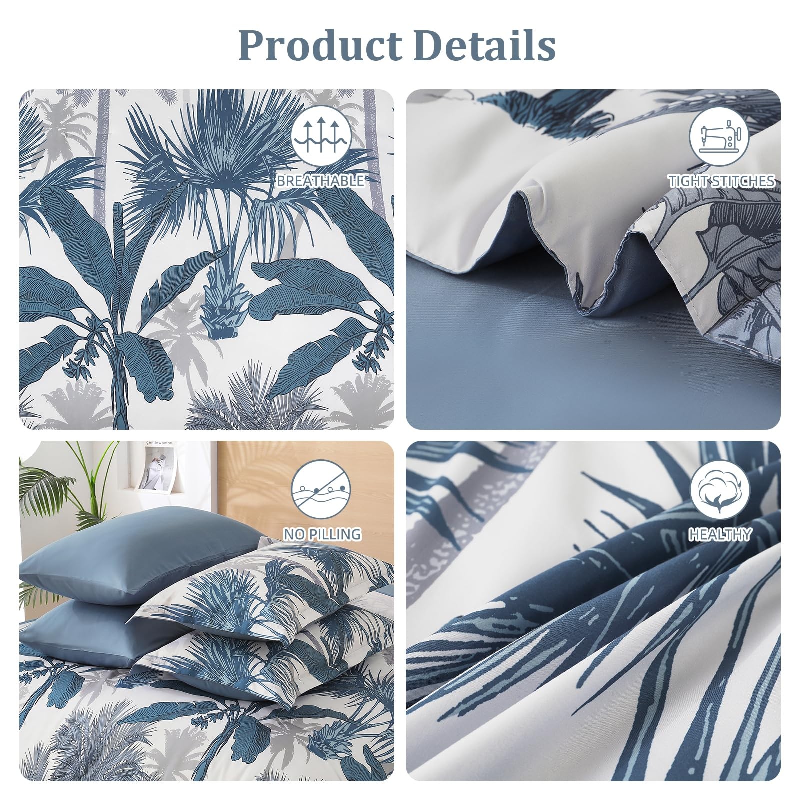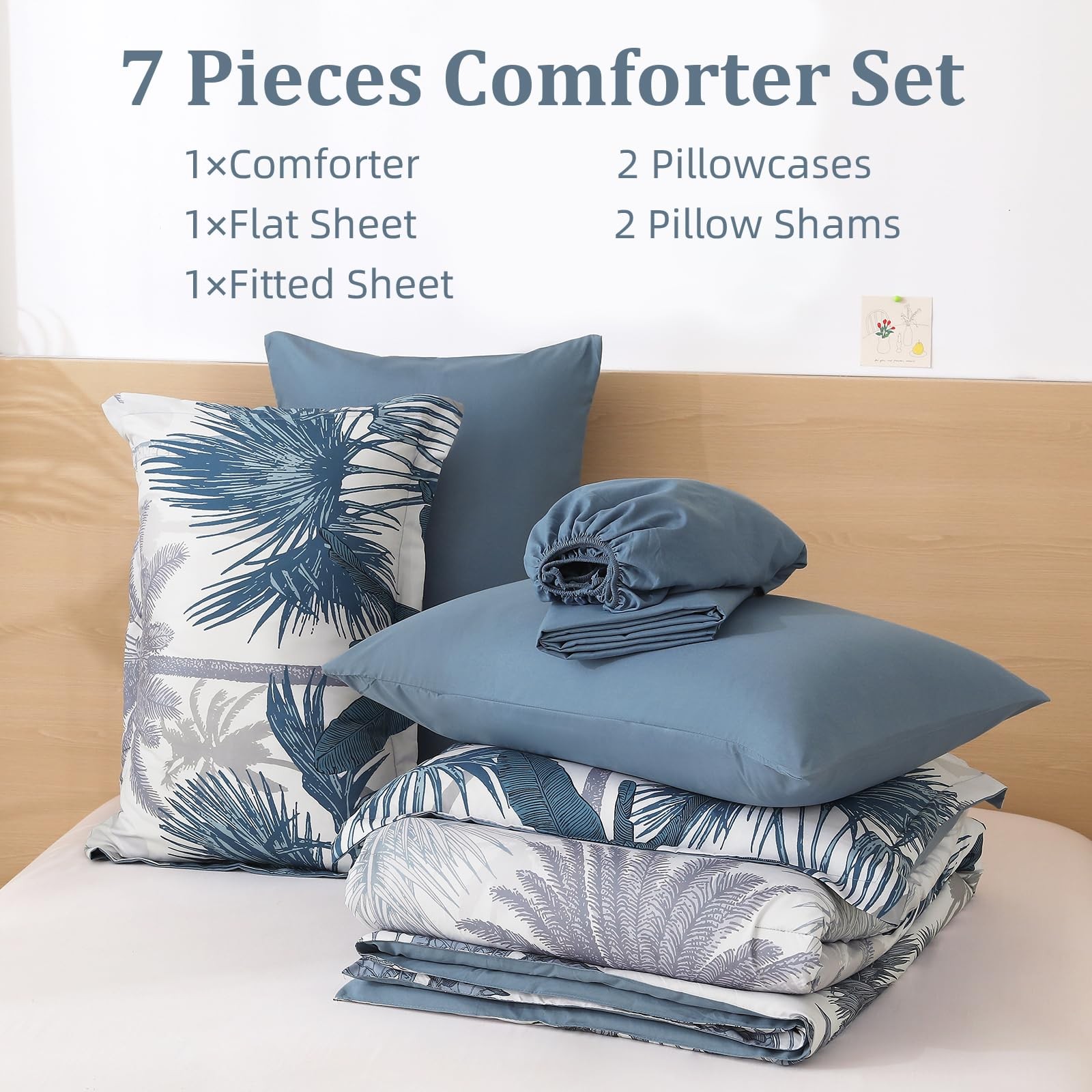 Comforter Set Queen Size, 7 Pieces Dark Blue Botanical Bed in a Bag, Soft Mic...