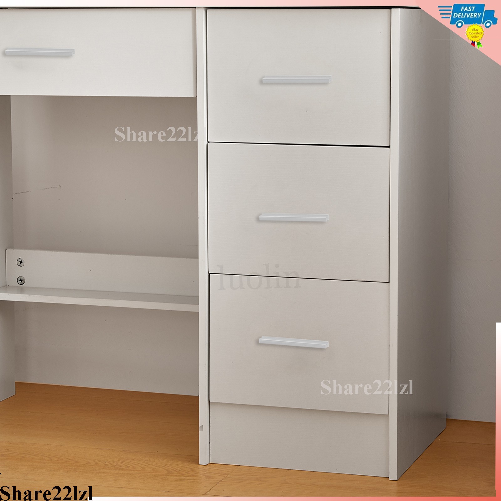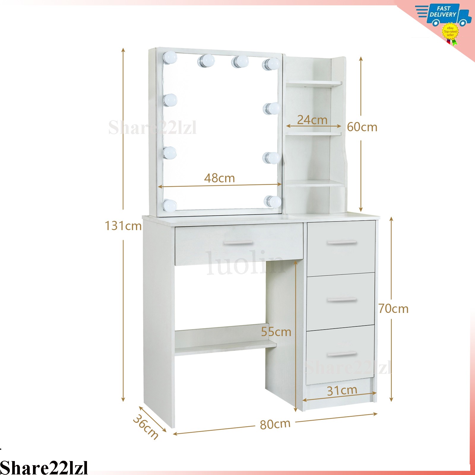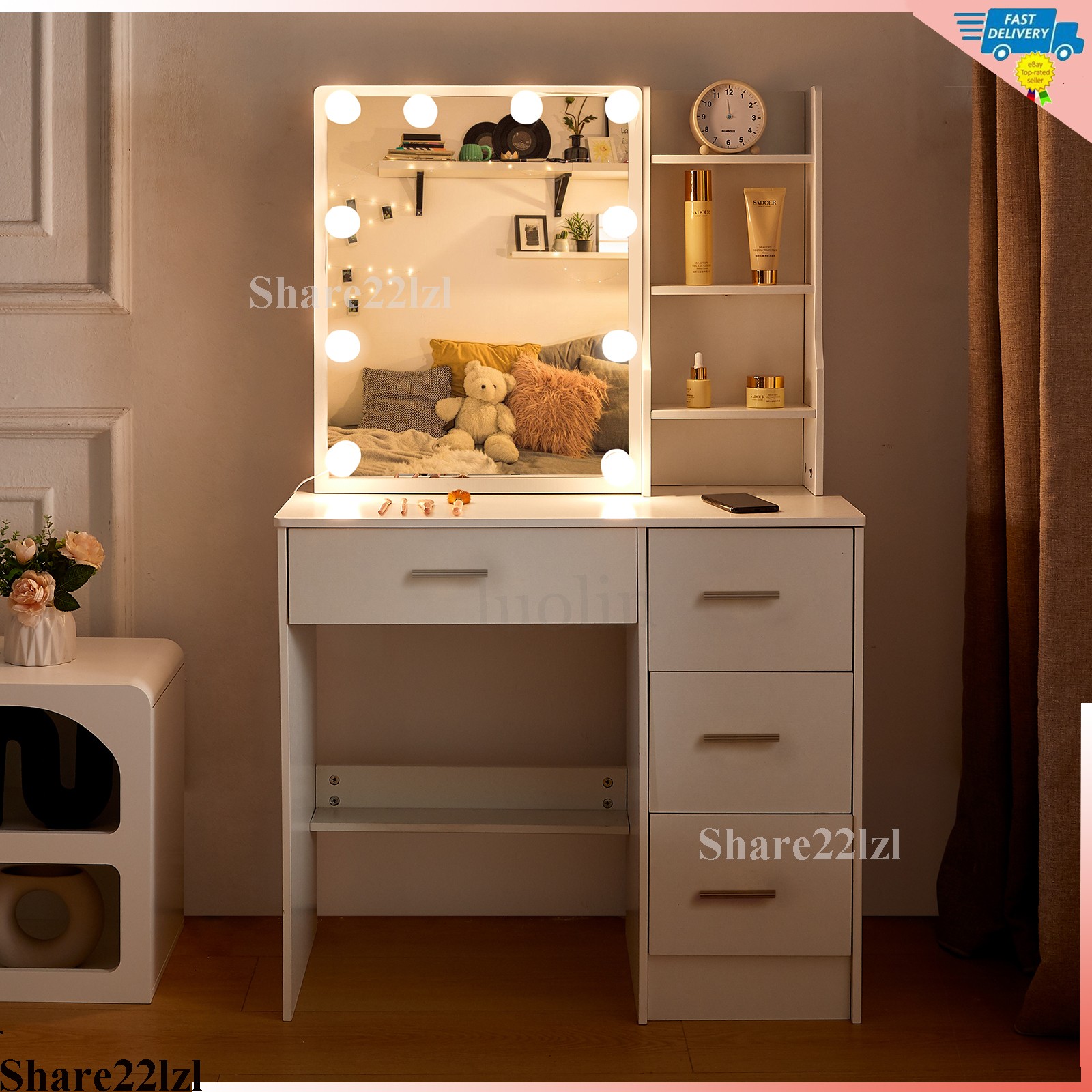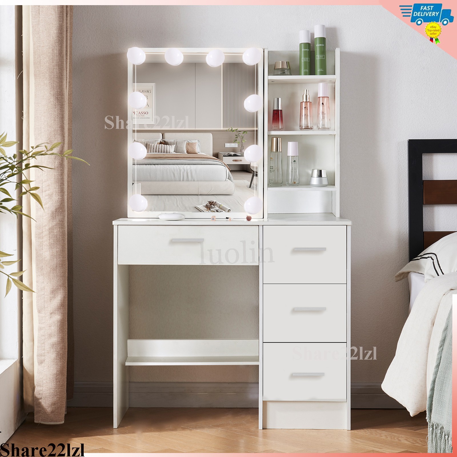 как выглядит Vanity with Mirror and LED Lights 10 Bulbs with 4 Drawers Dressing table Makeup фото