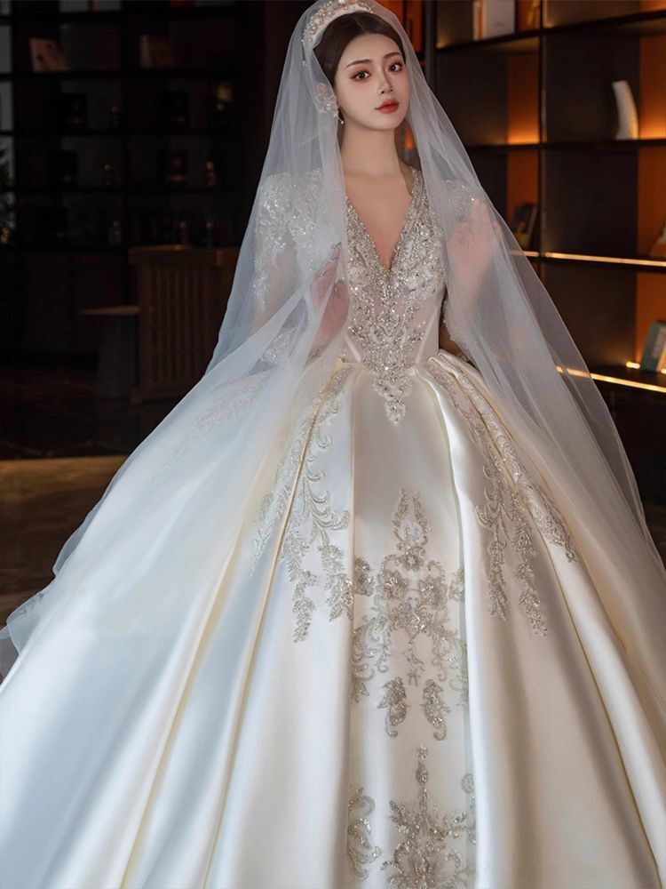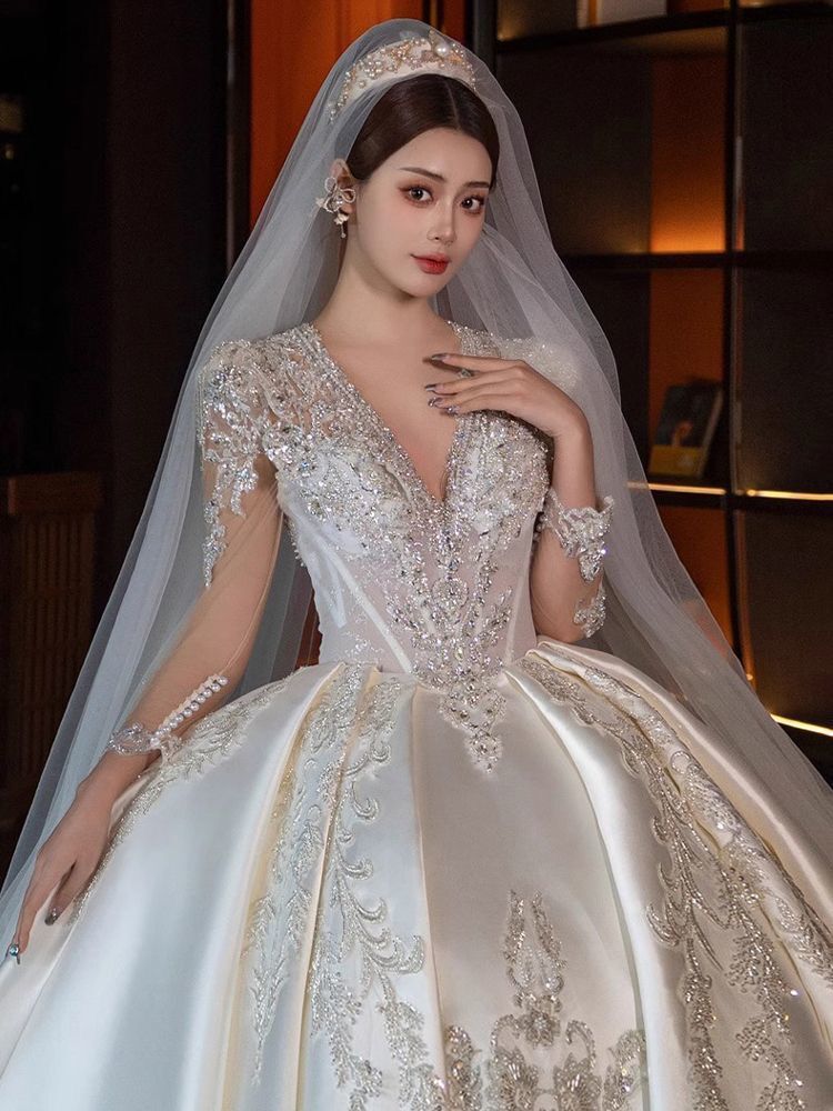 Long Sleeve V Neck Satin Wedding Dresses Ball Gown Sequin Applique Floor Length