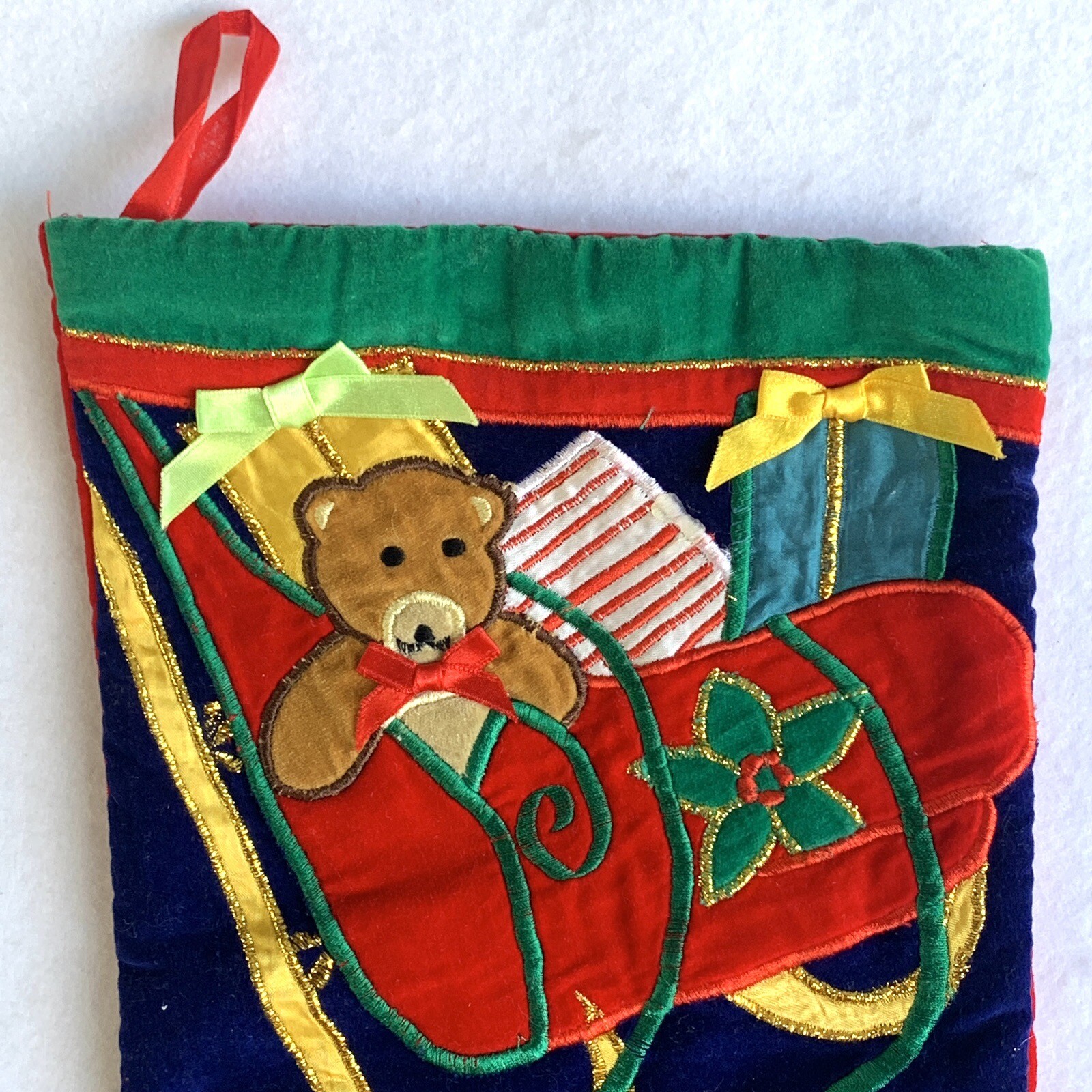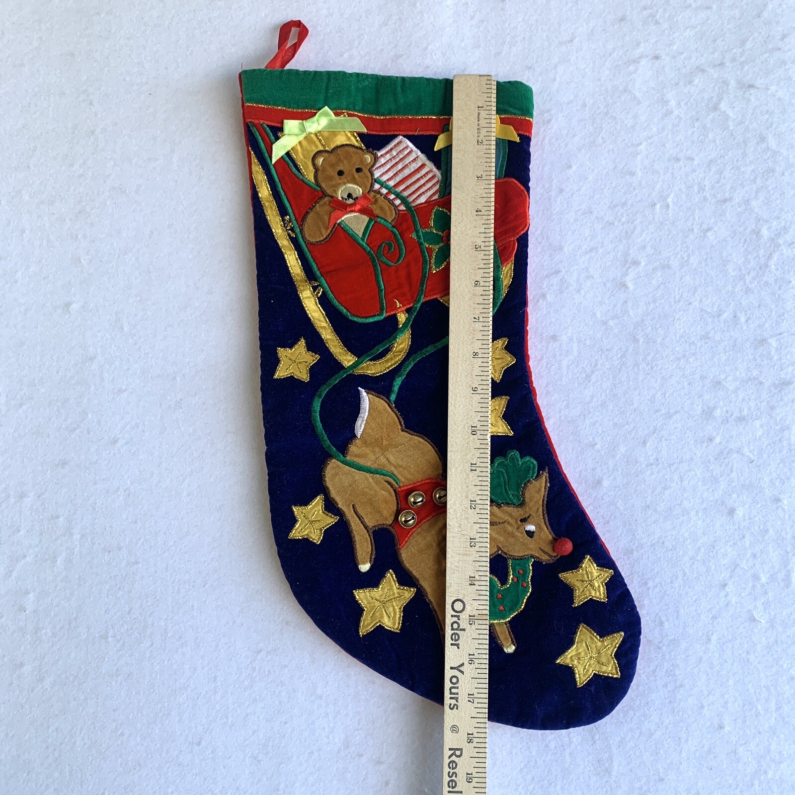 как выглядит Vintage Christmas Stocking Applique Reindeer Rudolph Sleigh Teddy Bear 17.5 фото