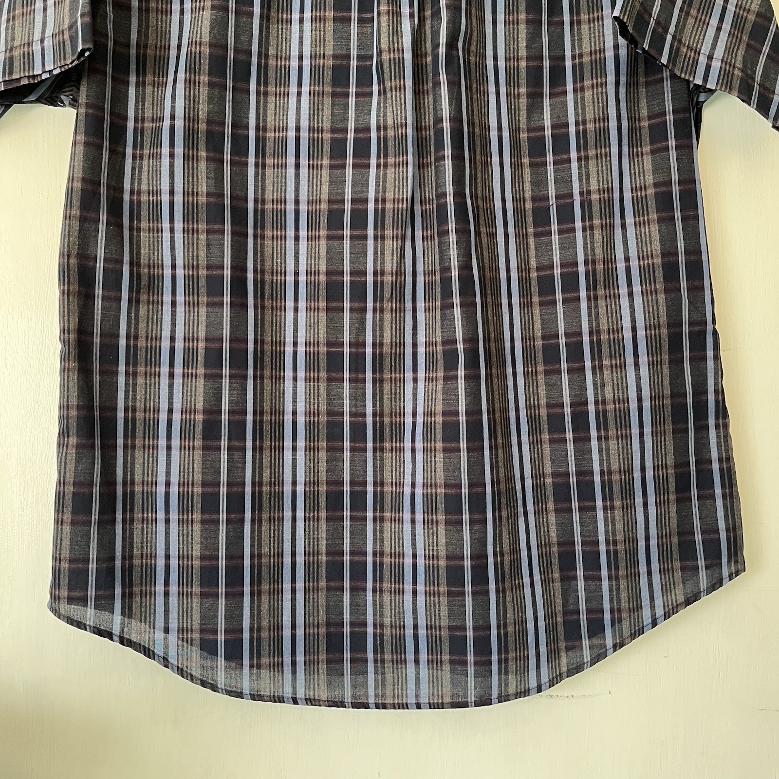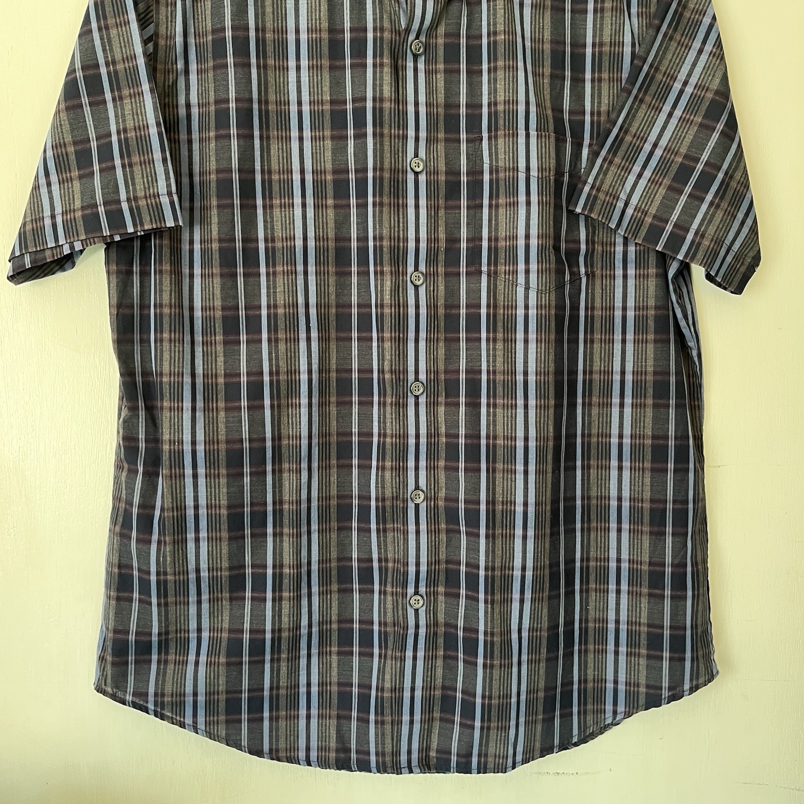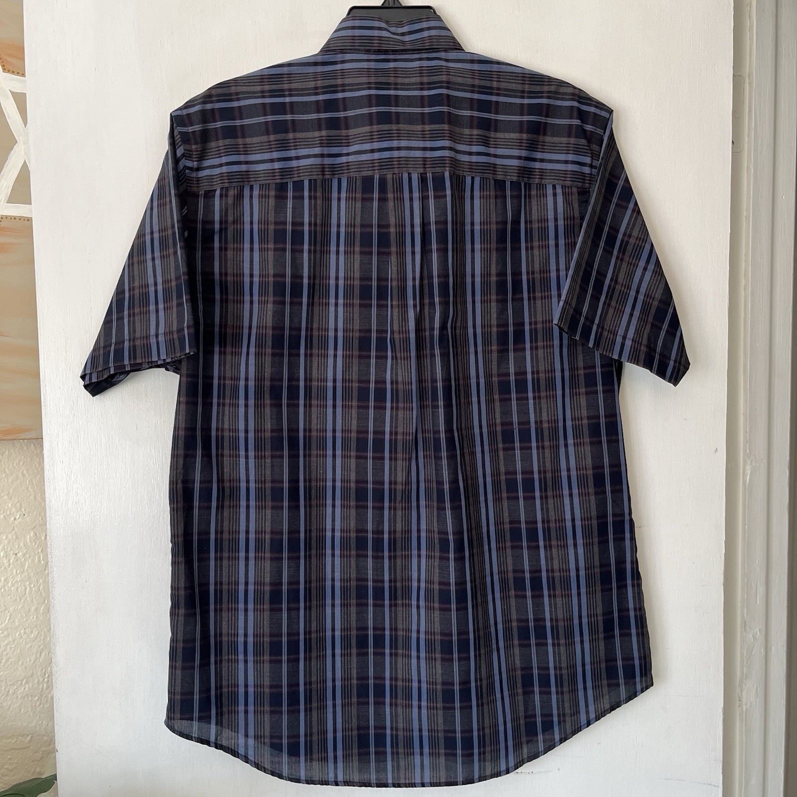Van Heusen Mens Size Medium, 15-15.5, Grey Black, Plaid, Button Up, Short Sleeve