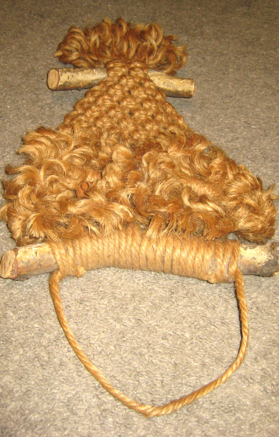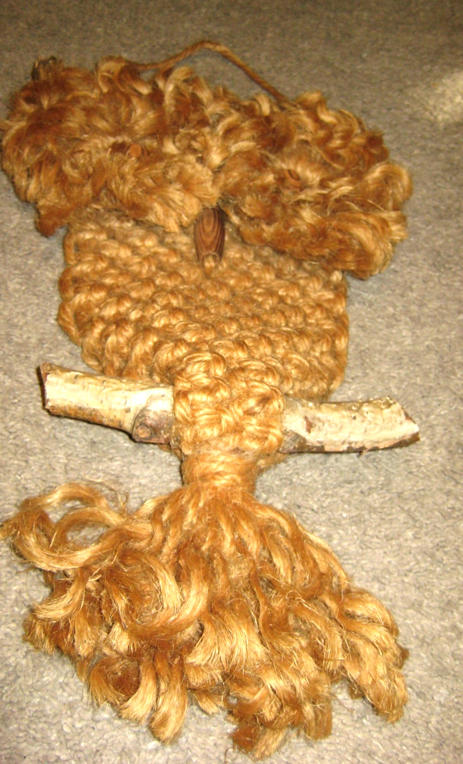Vintage Kitsch Macrame Owl Wall Hanging Brown Jute Branch Wood Eyes 22 x 10