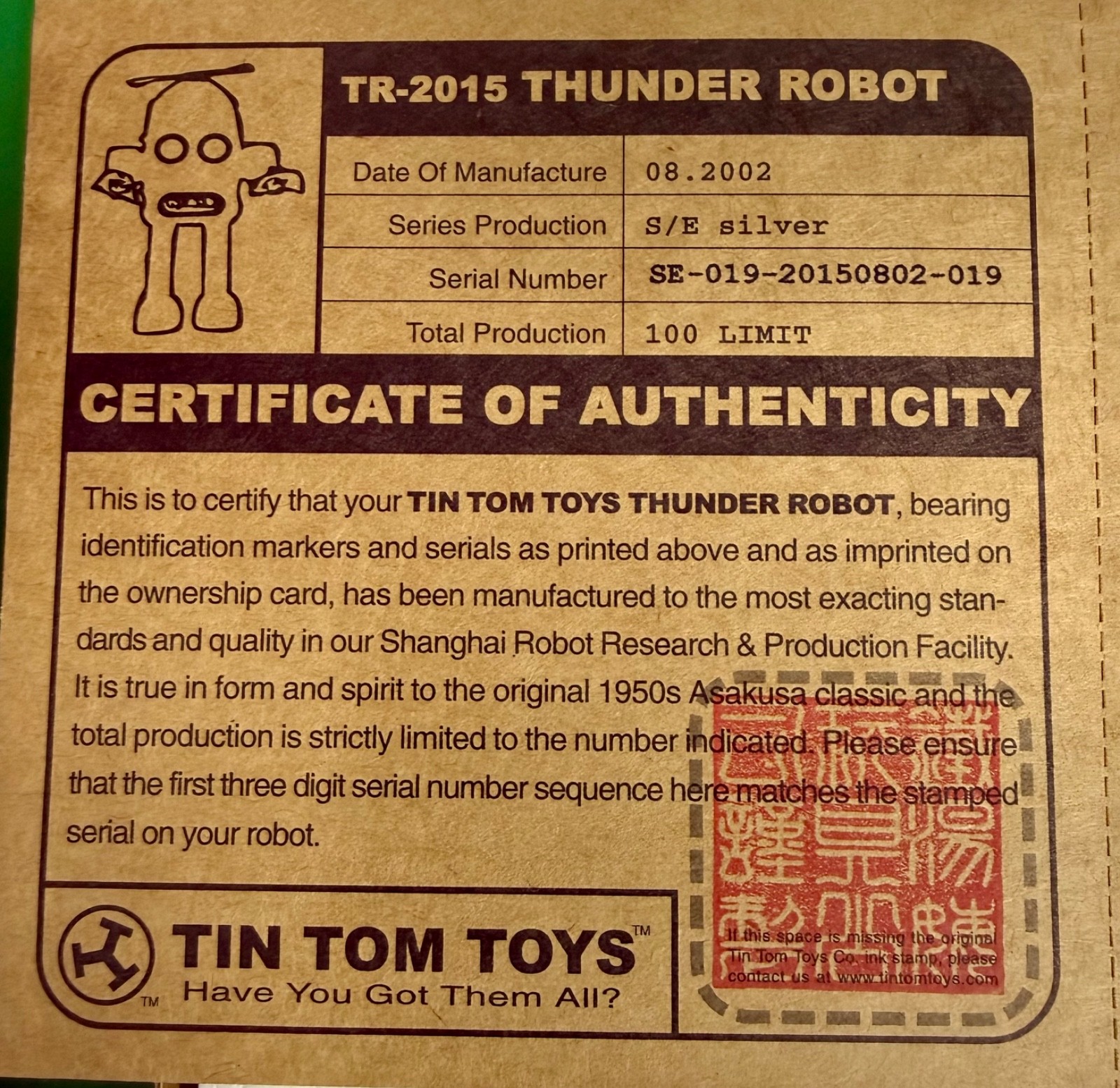Thunder Robot 11 Tinplate Battery Op 2002 Tin Tom Toys Silver L.E. 1/100