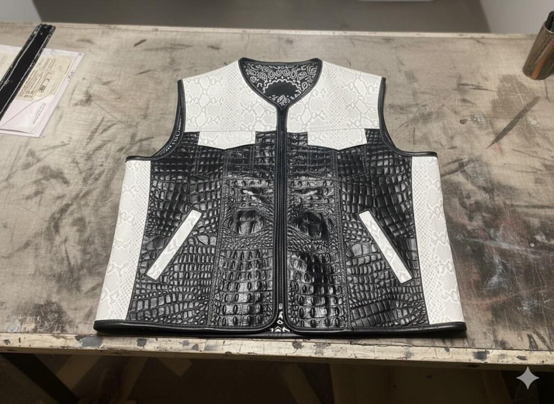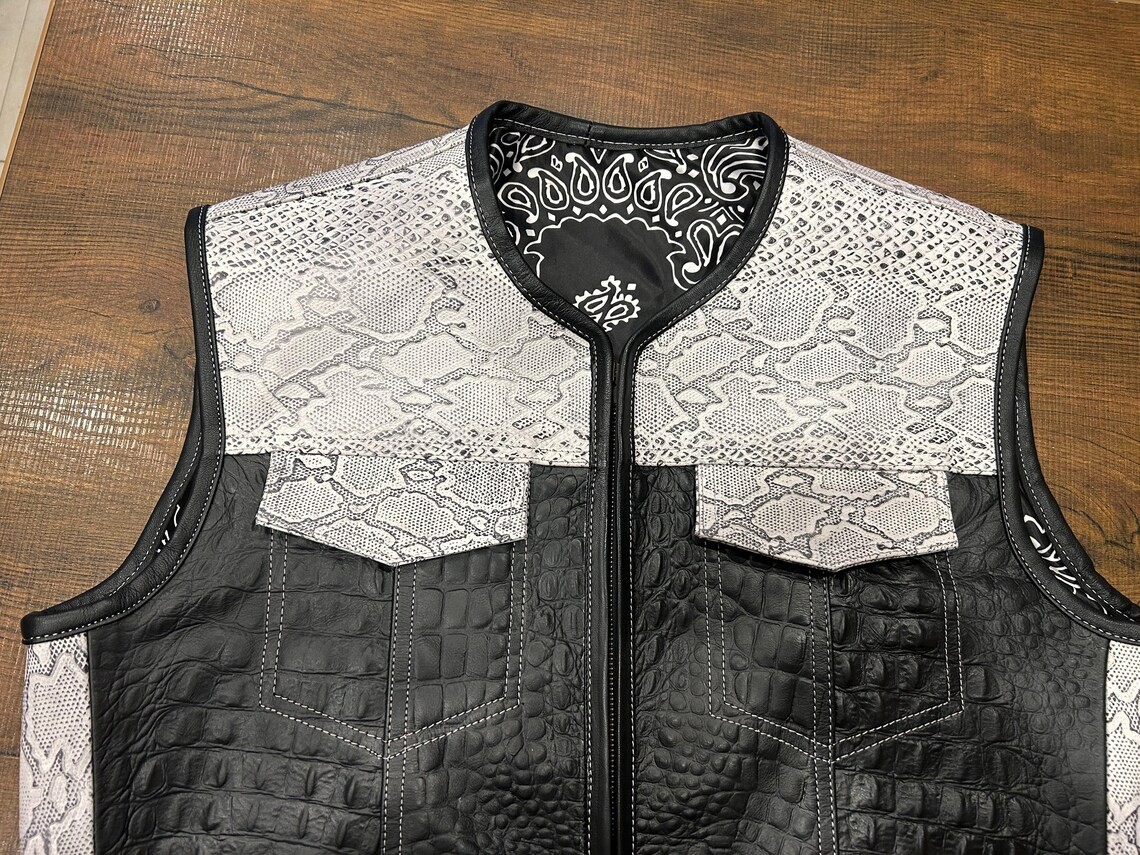 Real Leather Black Embossed Vest with White Skin Detail, Biker Style, Motorcycle