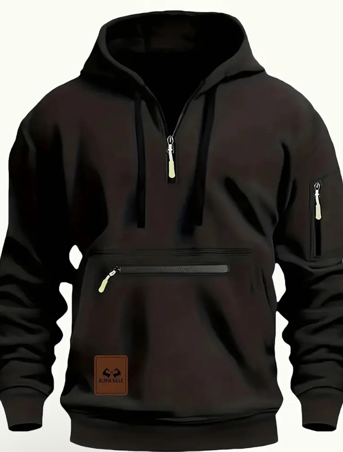 Men s Casual Black Hoodie with Zipper Pockets, Lightweight Outdoor Wear