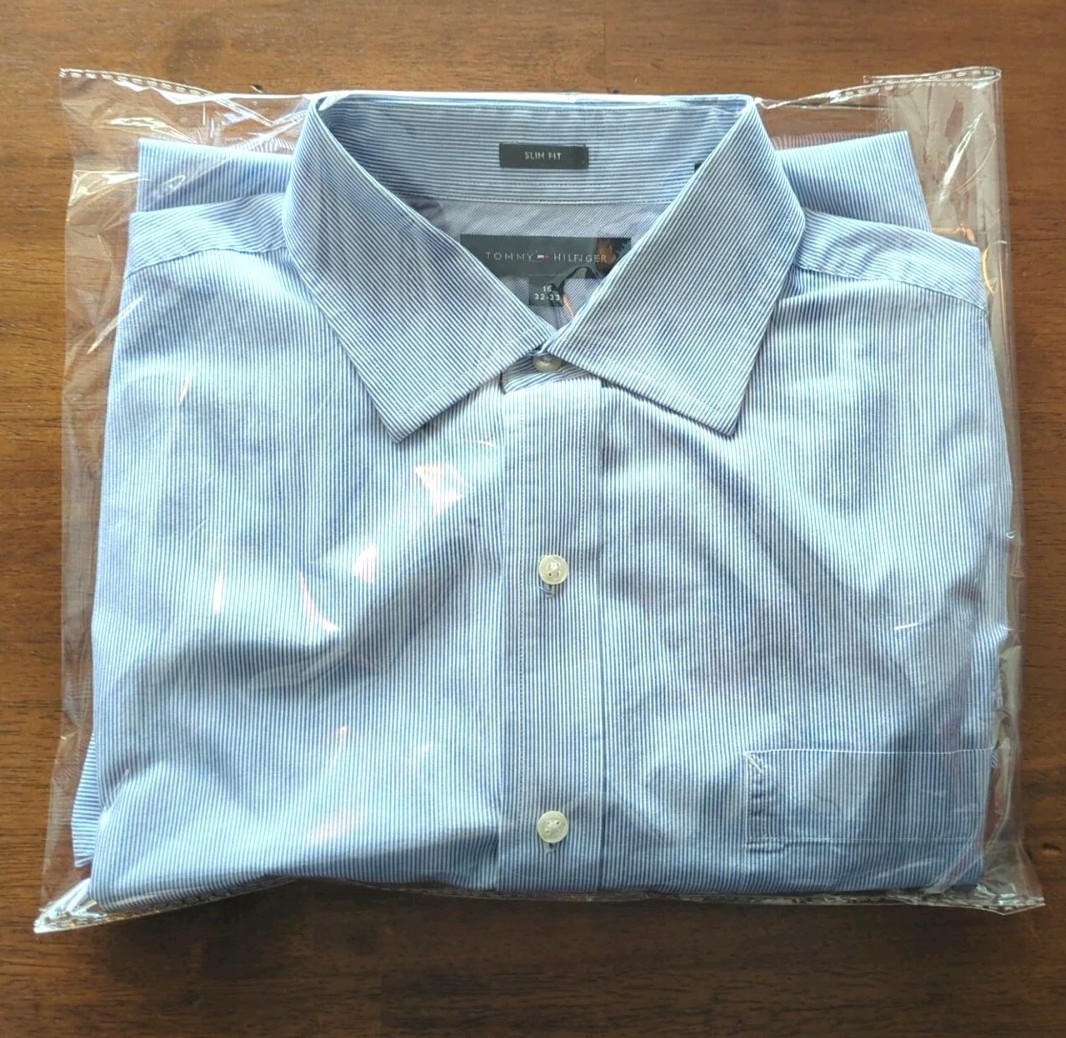 TOMMY HILFIGER Slim Fit Blue/White Striped Shirt. Size 16. 32-33. 100 Cotton