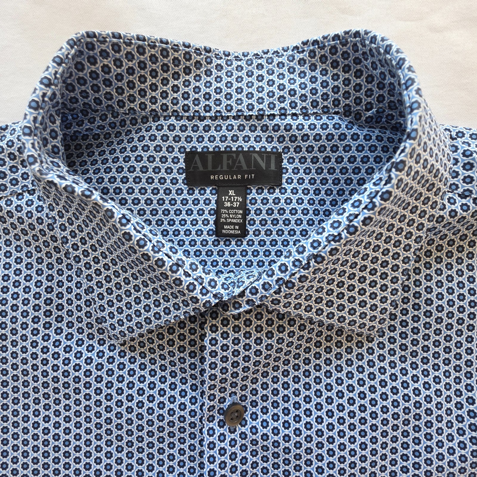 Alfani Regular Fit XL Blue Geometric Button Front Dress Shirt Stretch 17-17.5