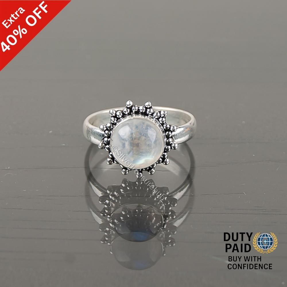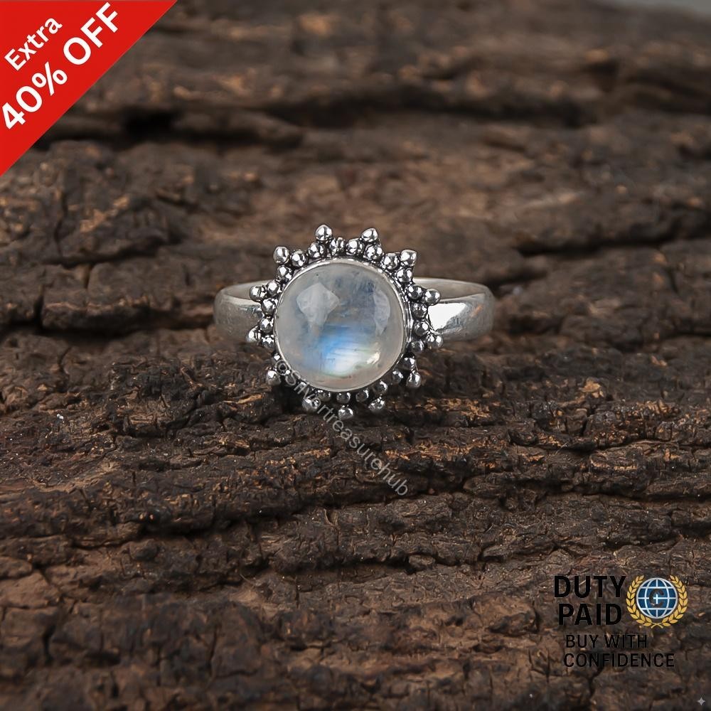 Round Rainbow Moonstone Gemstone 925 Silver Band Statement Wedding Ring Jewelry