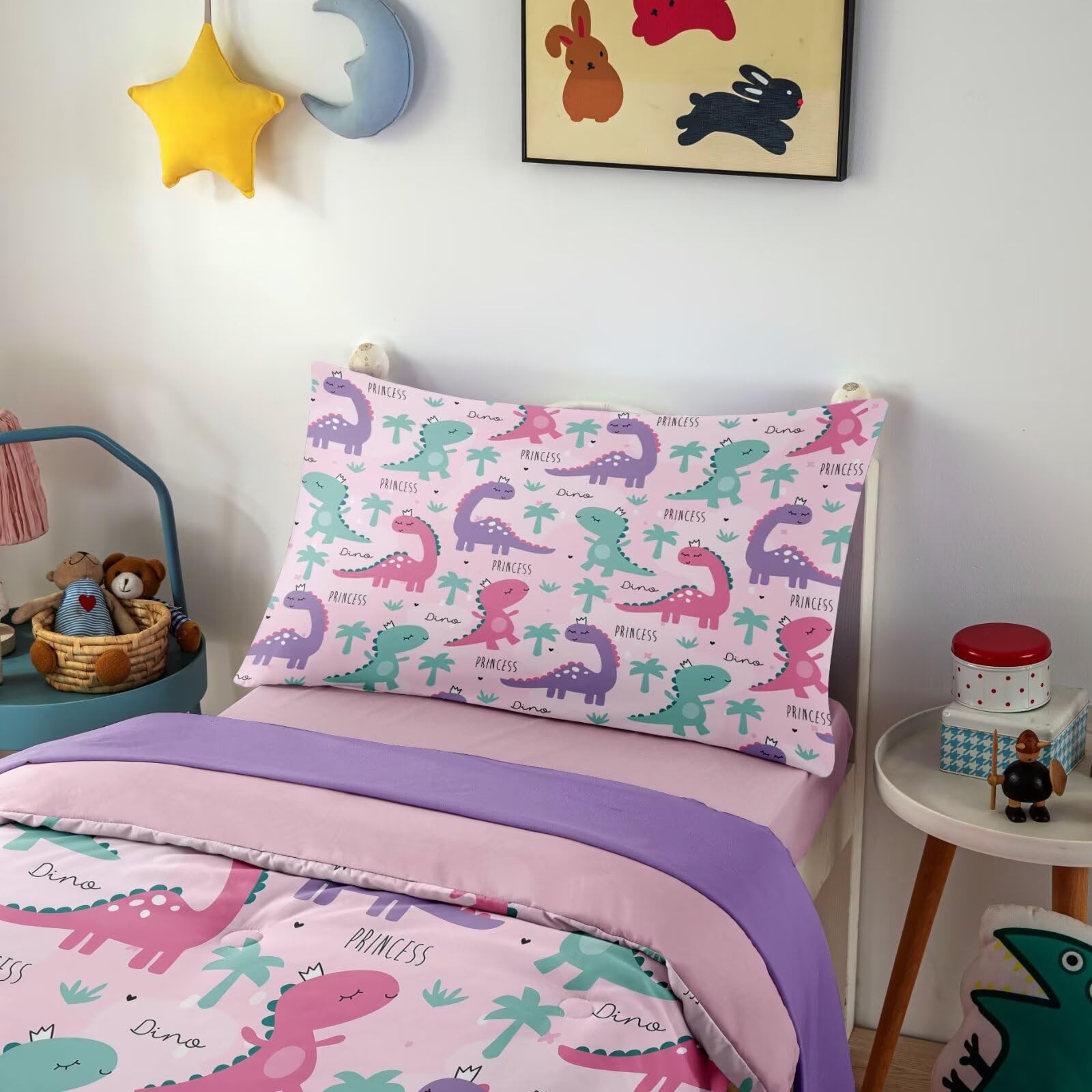 4 Piece Toddler Dinosaur Bedding Set for Girls,Pink Dino Toddler Comforter Se...
