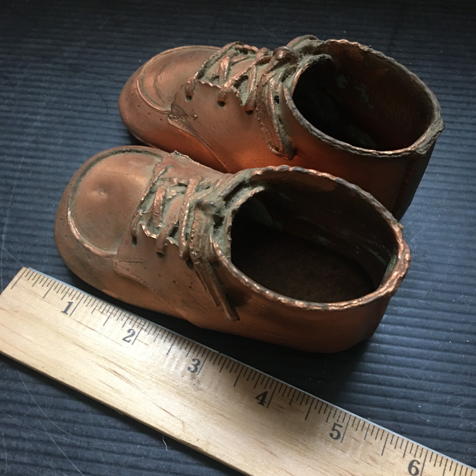 • Pair Of Vintage 1978 Copper Bronzed Metal Baby Shoe Wood Grain Resin Bookends