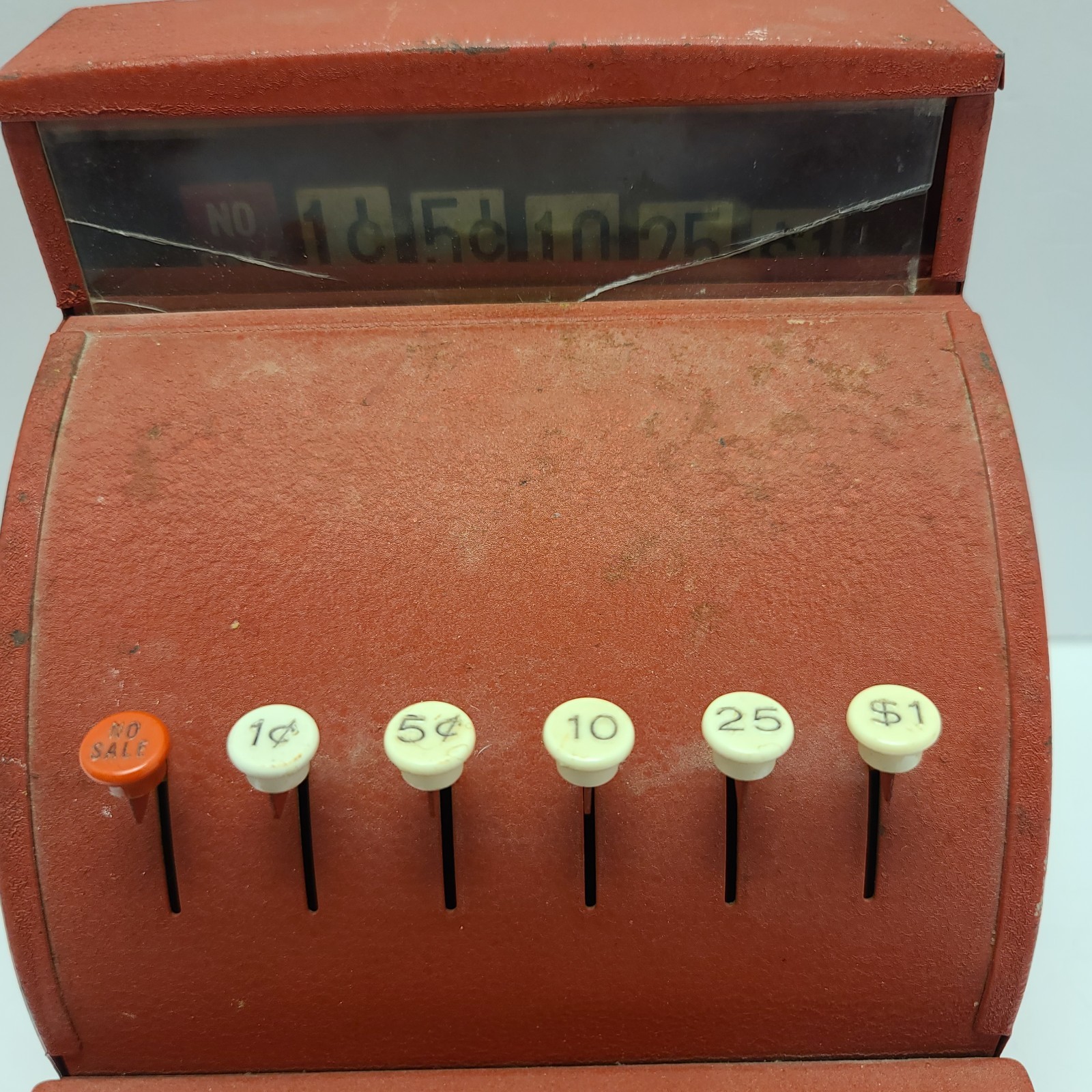 Vintage Red 1950's Western Stamping Co Tin Tom Thumb Toy Cash Register w/ Coins