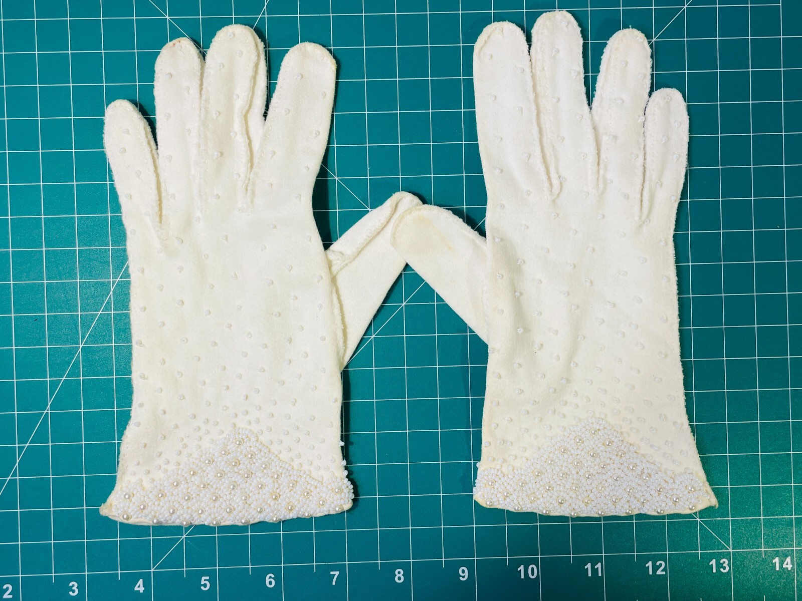 Vintage Double Woven Ladies White Pearl Gloves Made In British Crown Hong Kong