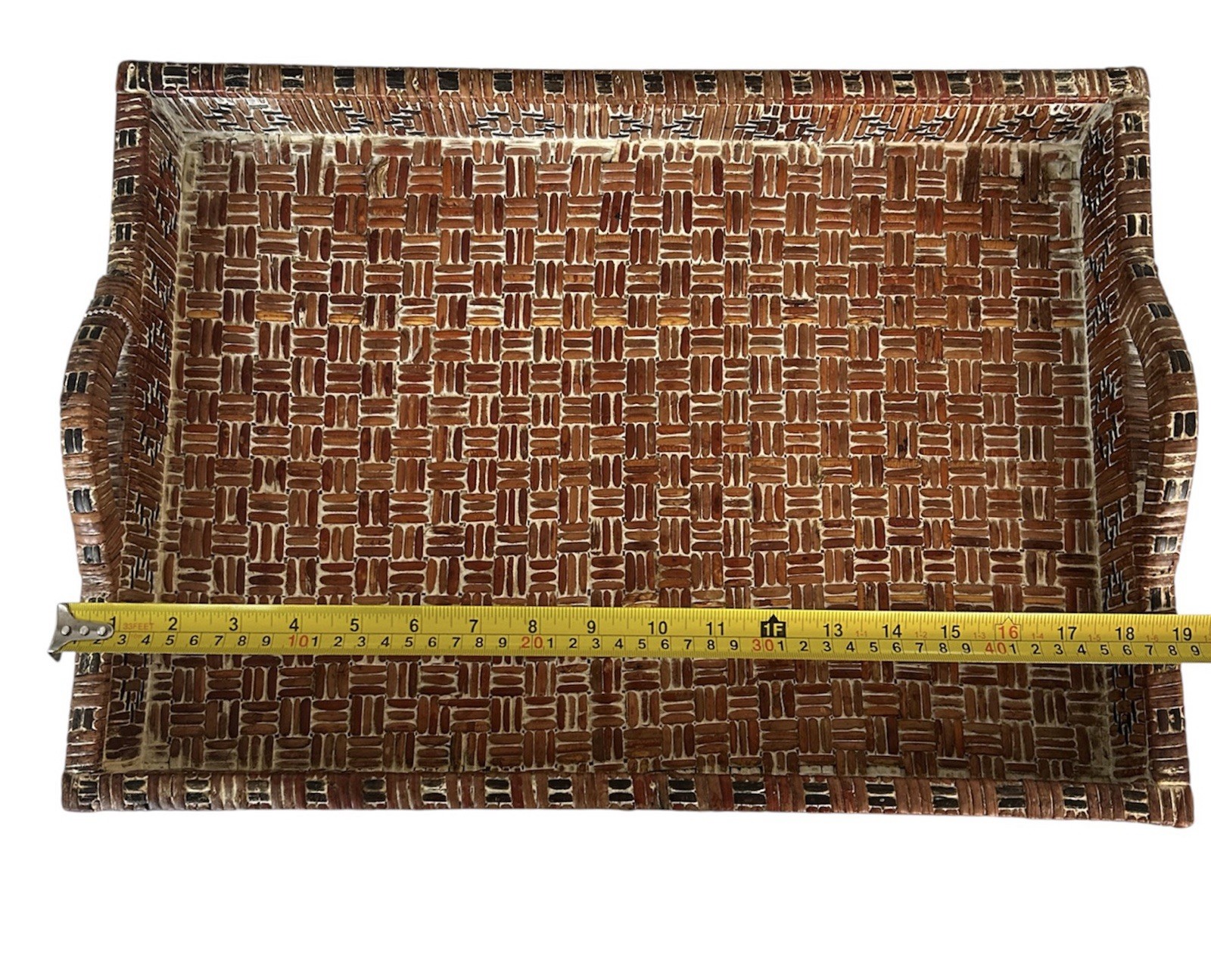 Vintage Woven Inlay Wooden Serving Tray Bohemian Basket Weave Rectangular Handle