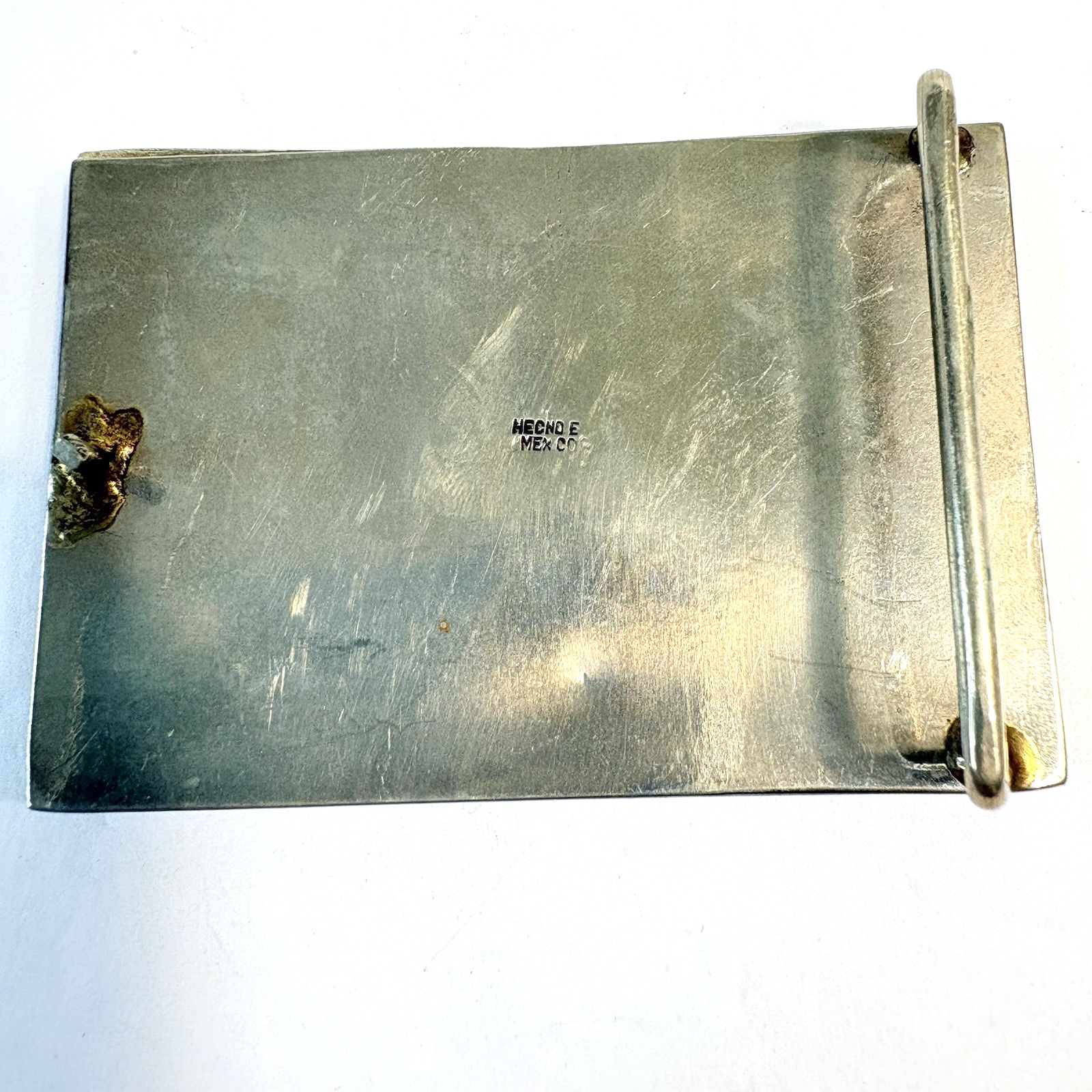 Vintage Mexican Belt Buckle Abalone Inlay Heavy Silvertone Aztec Calendar 3 1/4