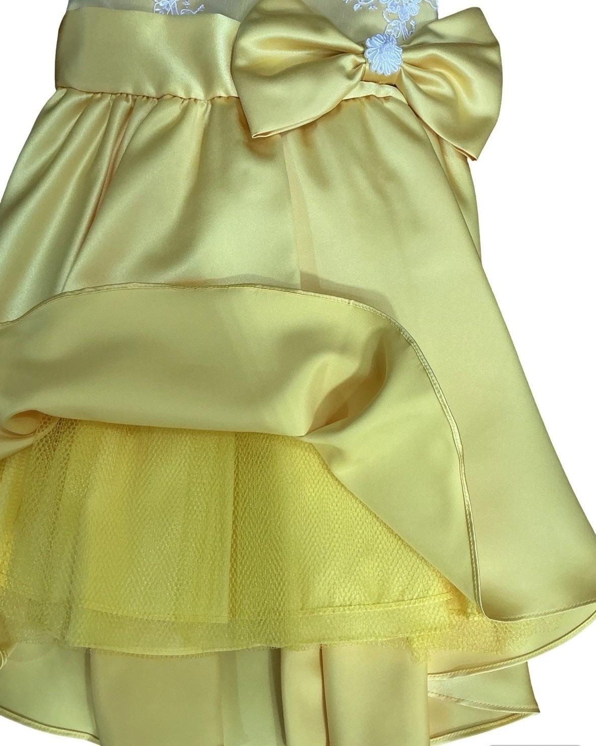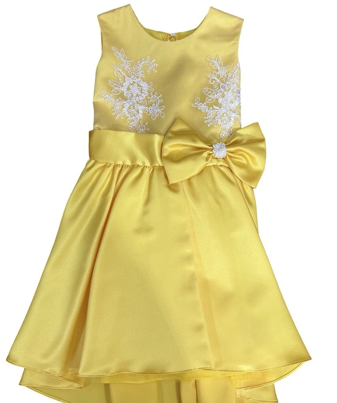 Girls Yellow Satin Formal Dress with White Mesh Lace Bow and Floral Detail