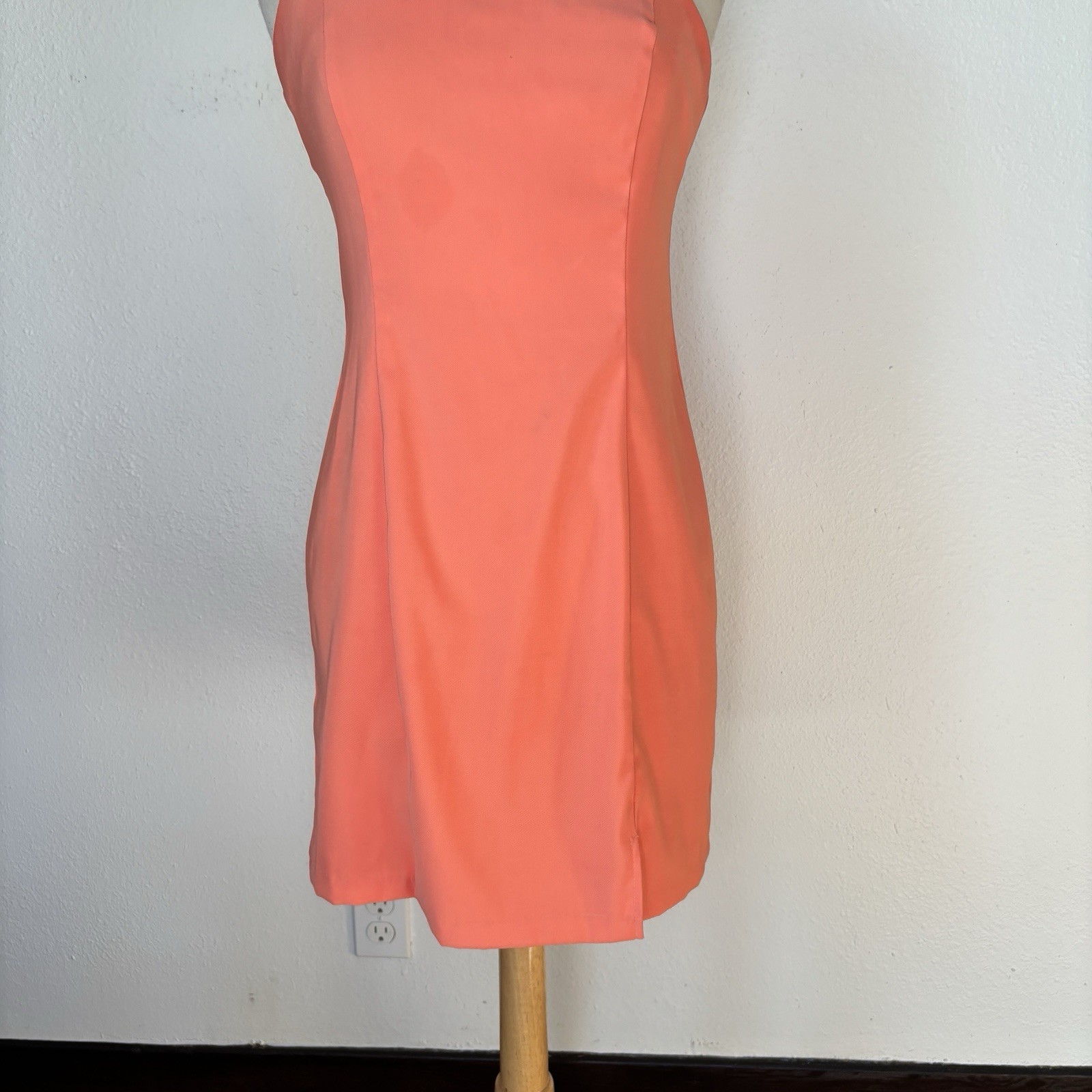 как выглядит Vintage 90s City Triangles Salmon Pink Fitted Floral Mini Dress Sz 9/10 фото