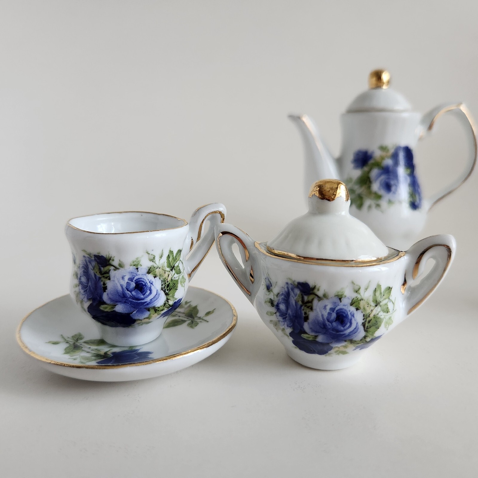 как выглядит Elegant Porcelain Blue Rose Mini Tea Set - 7 Pieces, Vintage Victorian фото
