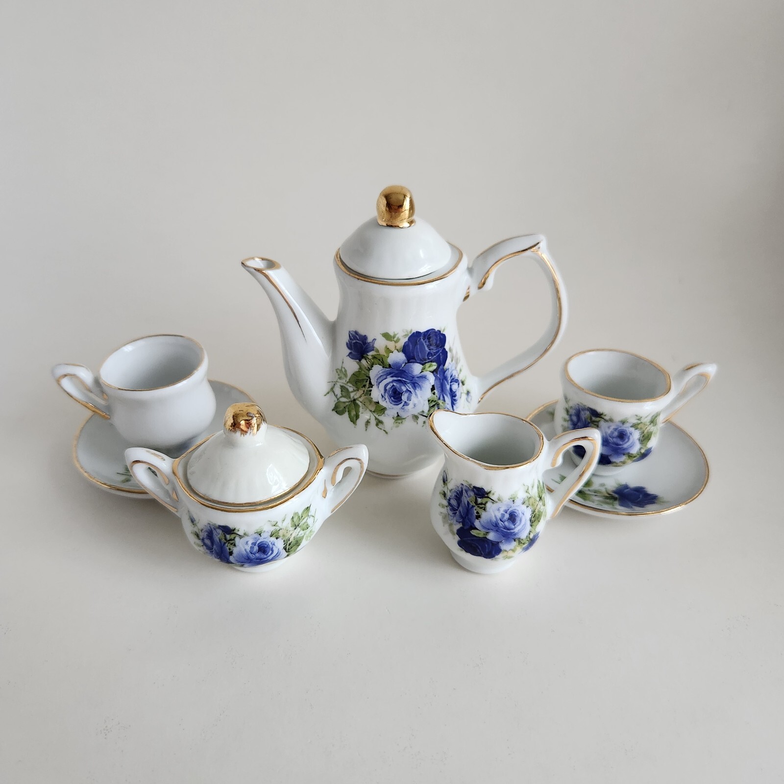 Elegant Porcelain Blue Rose Mini Tea Set - 7 Pieces, Vintage Victorian