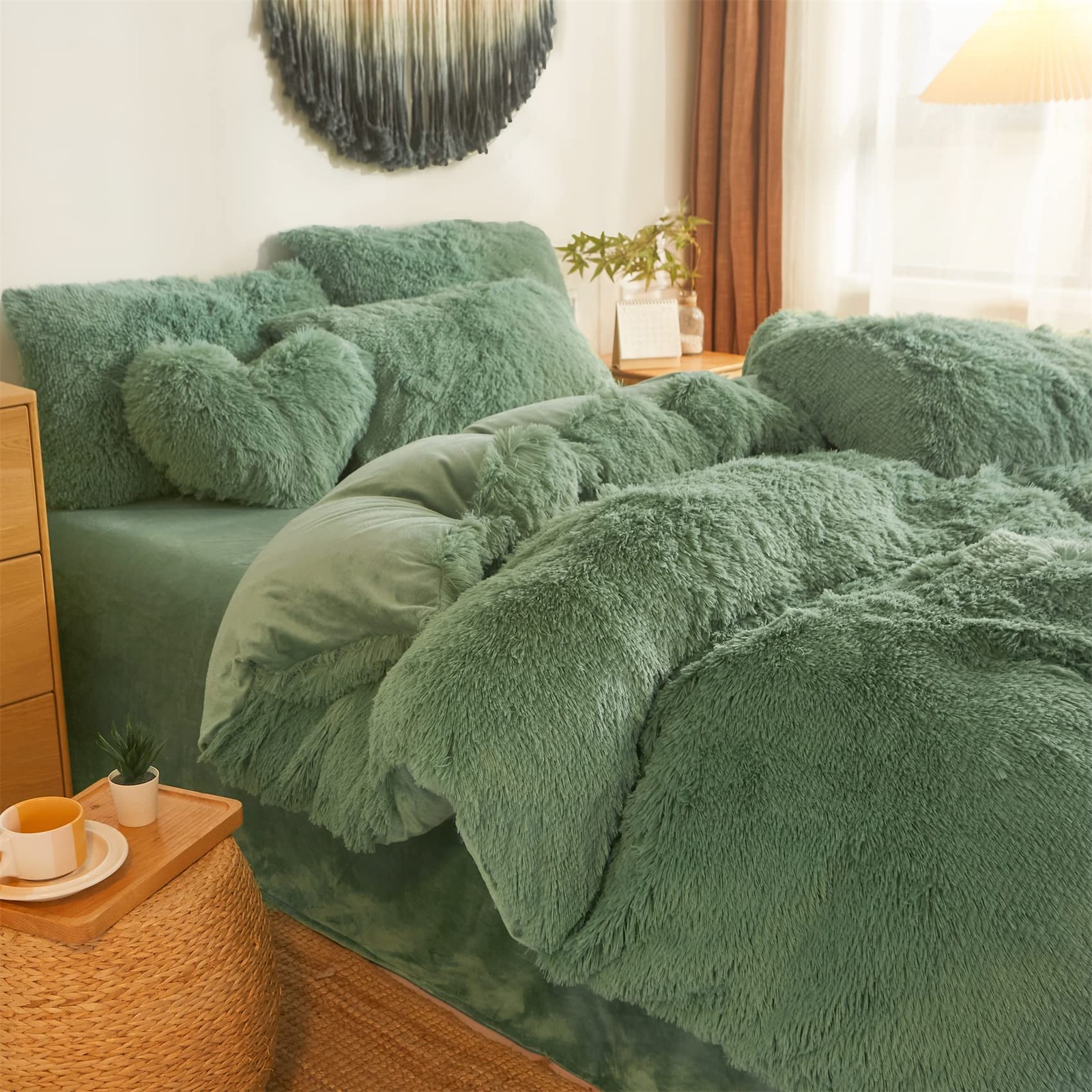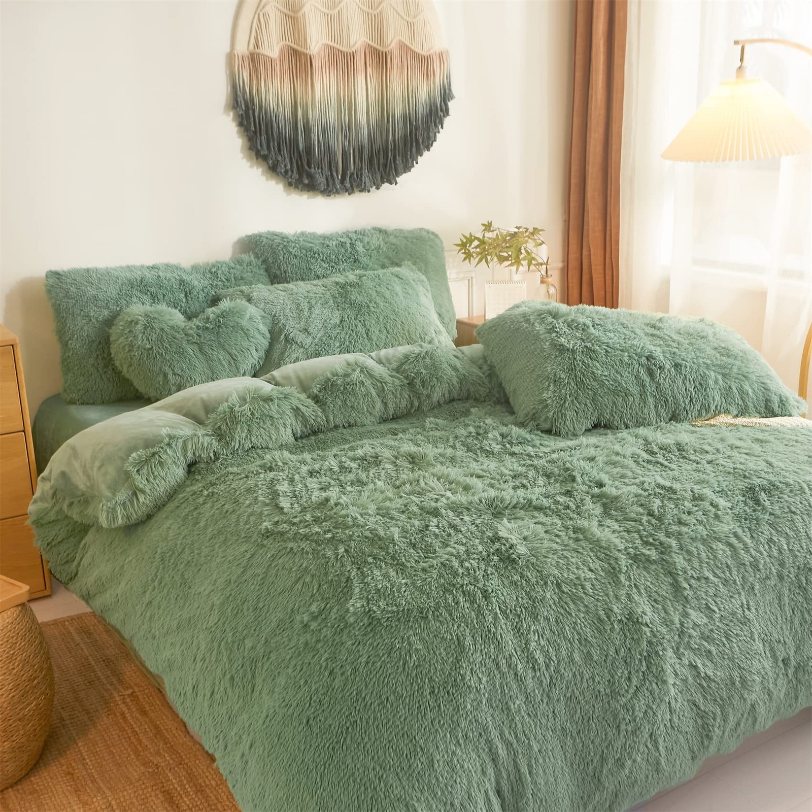 Shaggy Duvet Cover 5 Set, Fluffy Faux Fur Green Comforter Set Queen - Plush U...