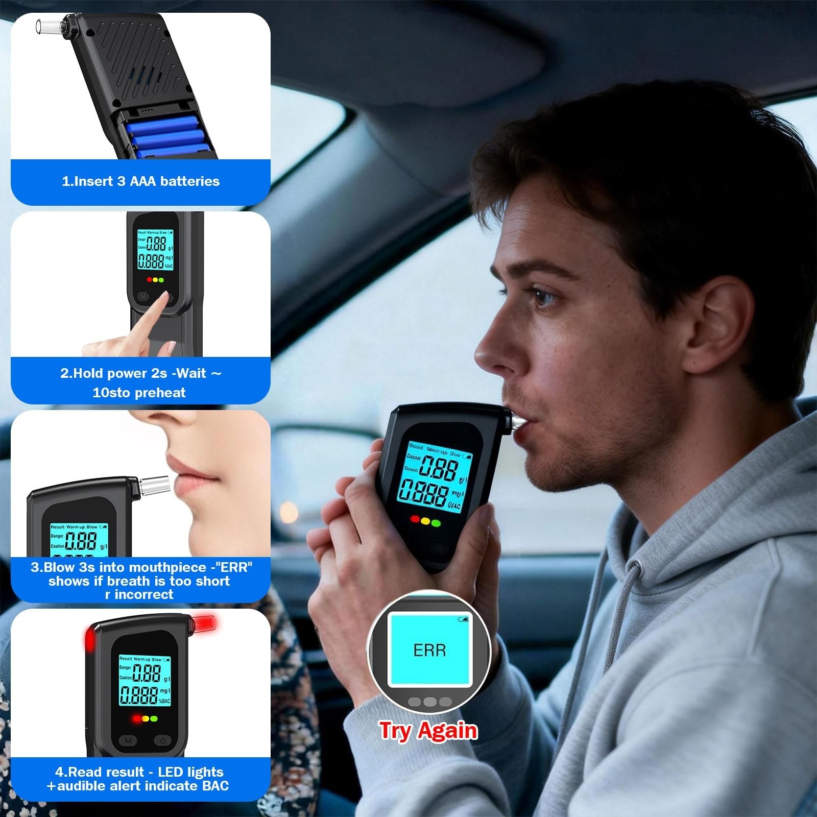 Breathalyzer, LCD Digital Alcohol Tester with 20 Mouthpieces - Portable Eas...