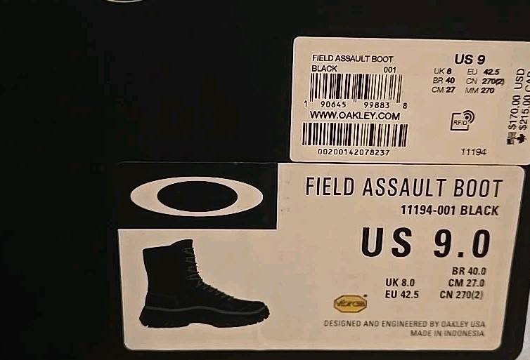 Brand New Oakley Field Assault Boots Size 9, 11194-001, Blackout, Vibram Sole