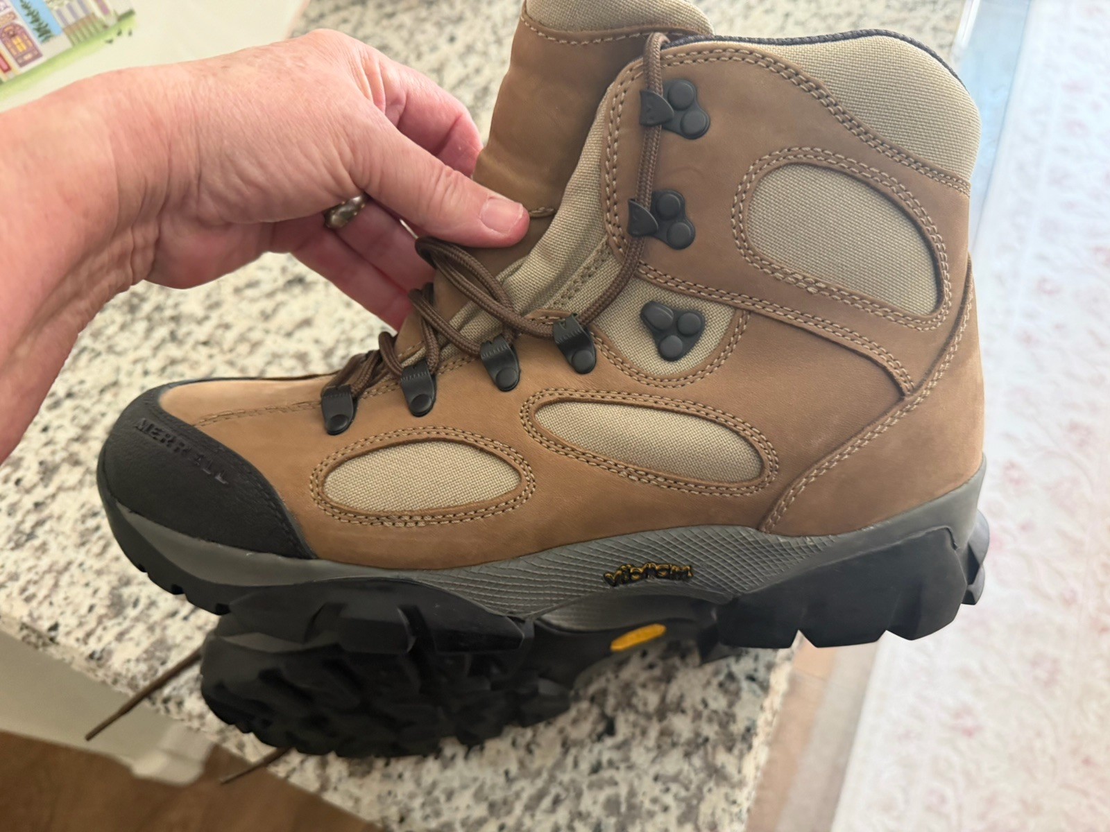 как выглядит Merrell Sawtooth Boots Mens 9.5 Walnut Brown Nubuck Hiking Vibram Sole J50743 фото