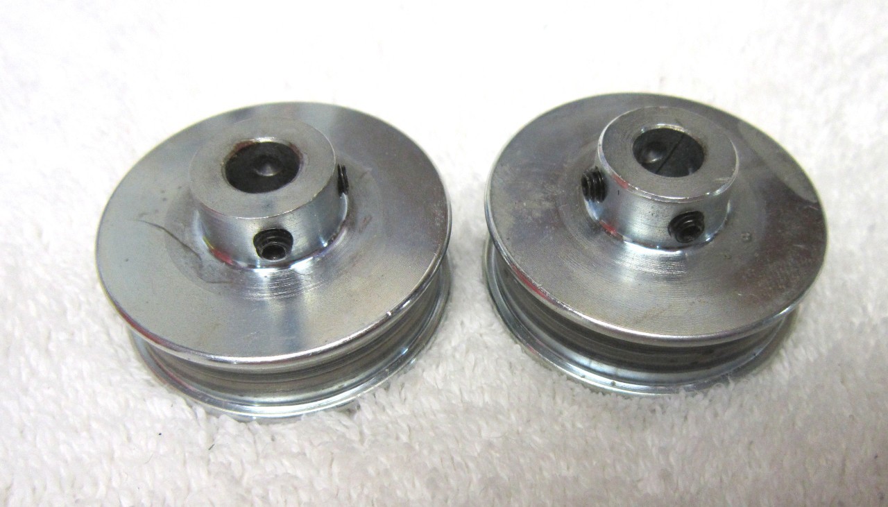 TWO 1-1/2 STEEL DRIVE FLAT BELT PULLEYS-3/8 WIDE WITH 5/16 CENTER W/SET SCREW