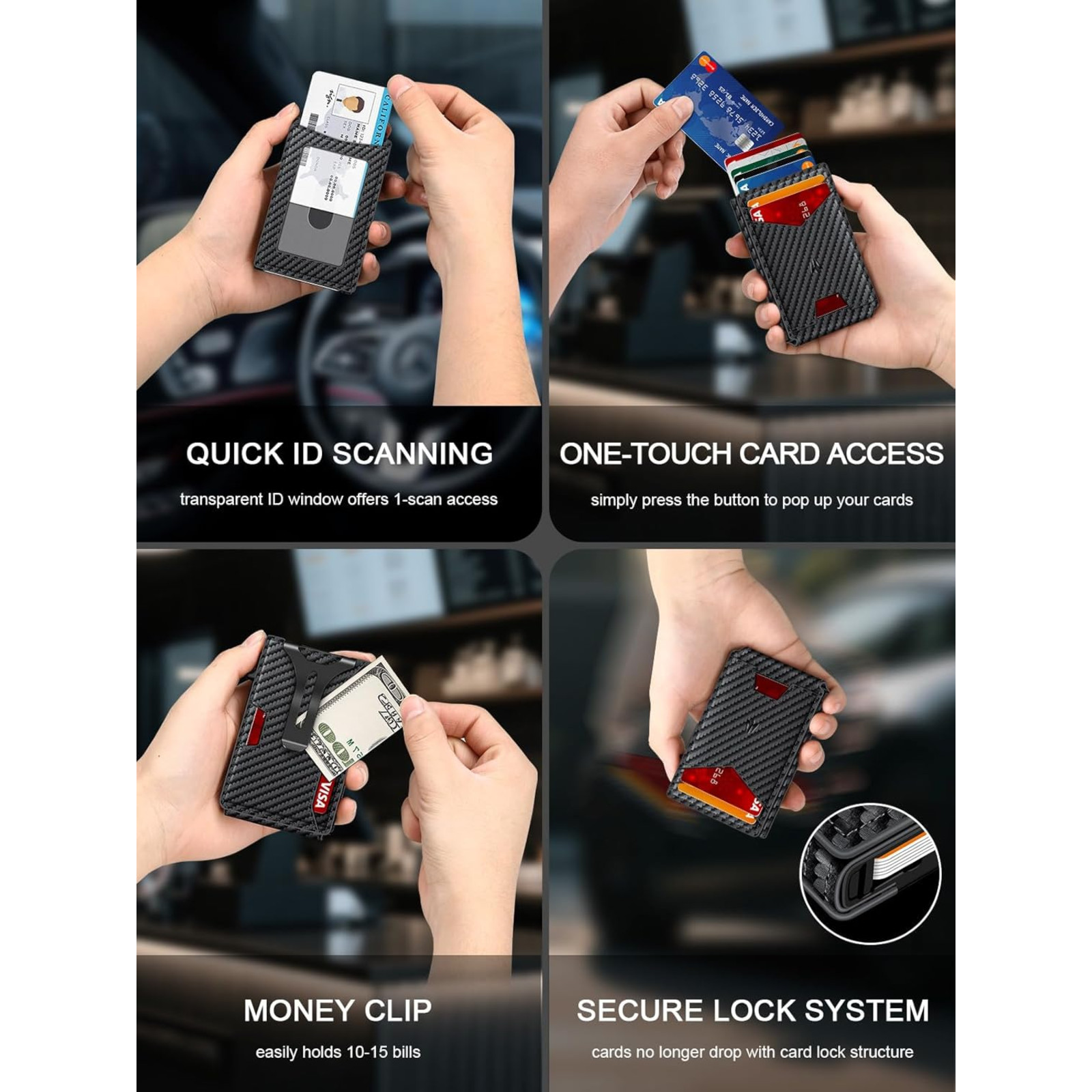 Men's Slim PopUp Bifold Carbon Fiber Wallet, RFID Blocking, Money Clip, Men Gift