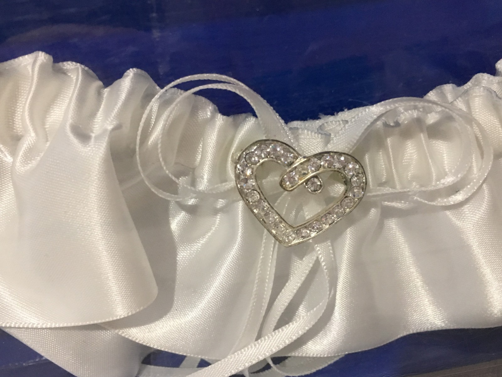 как выглядит BRIDAL WEDDING TOSS GARTER / WHITE SATIN WITH BOW AND JEWELED HEART фото