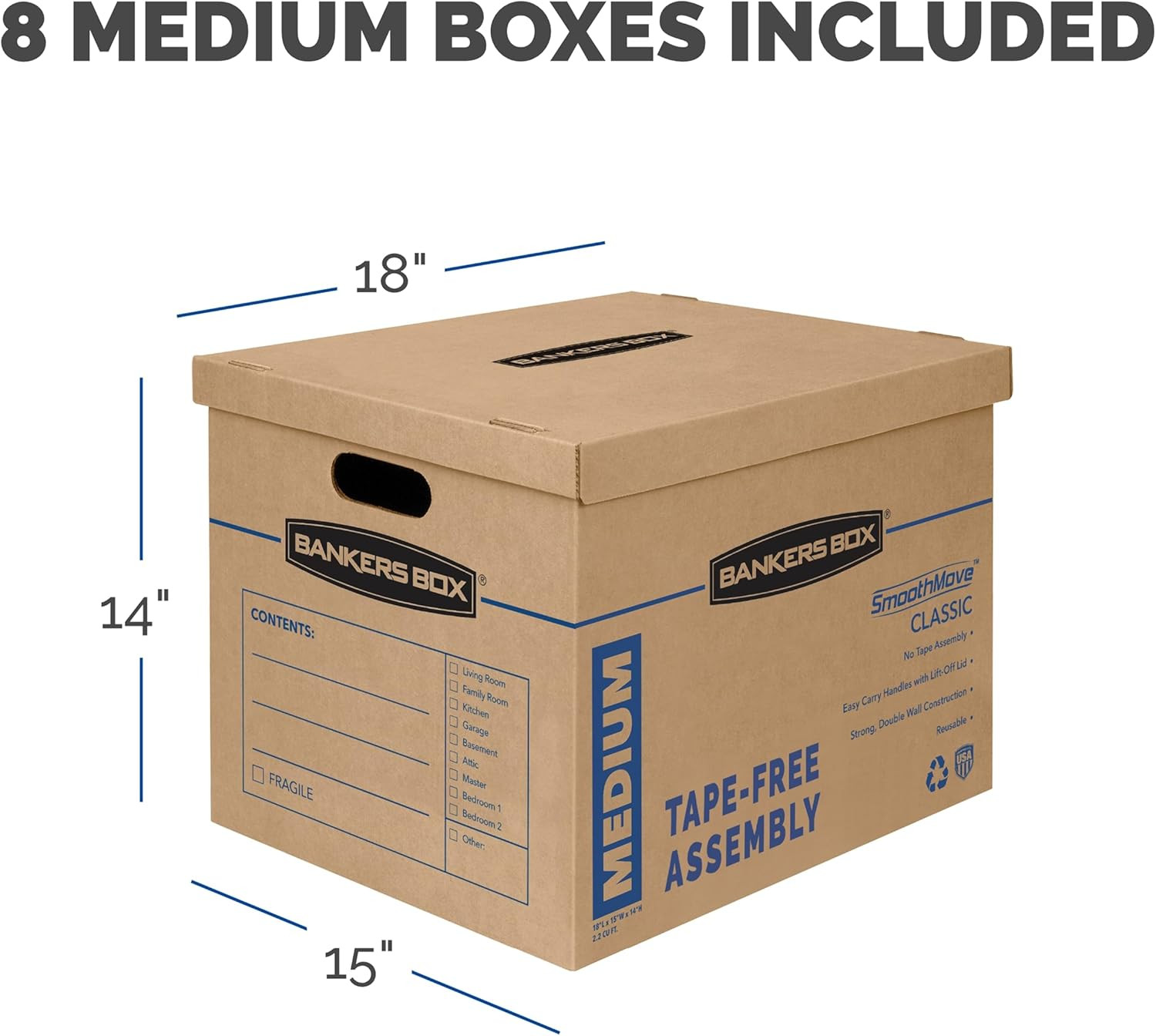 Medium Classic Moving Box 8 Pack, Reinforced Handles, Tape-Free Assembly, Box wi