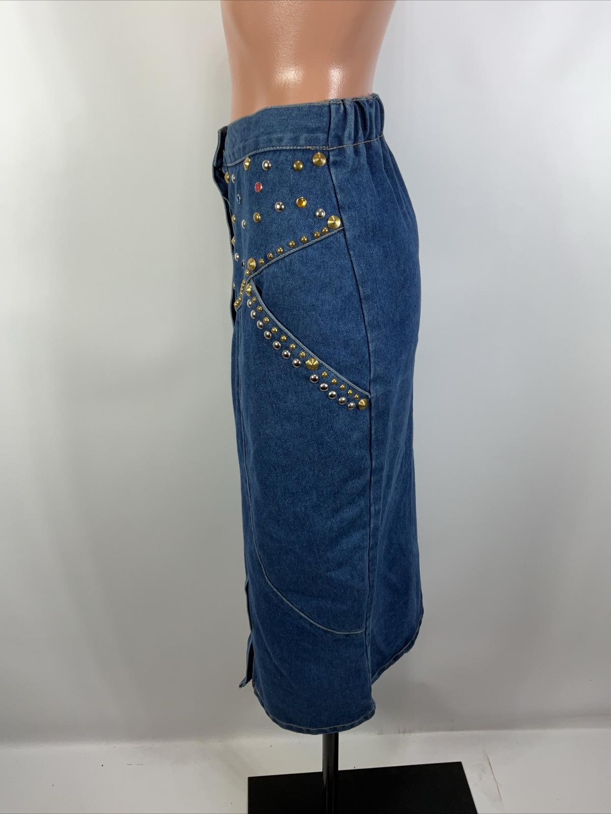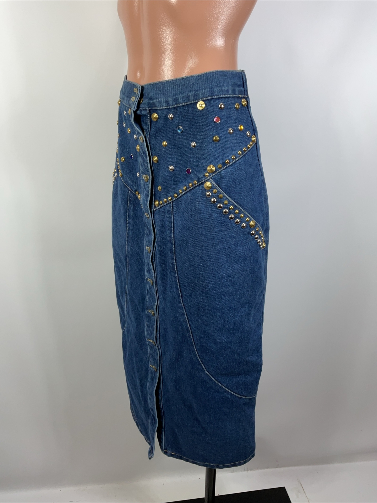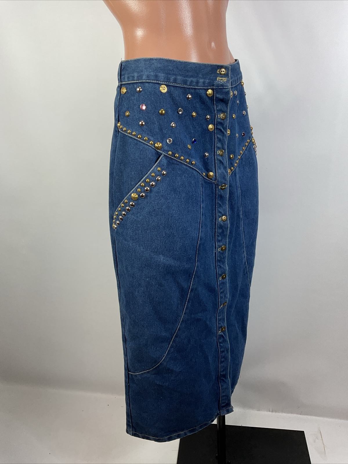 Vintage 90s 80s Embellished Denim Pencil Skirt M Button Front Gems Festival