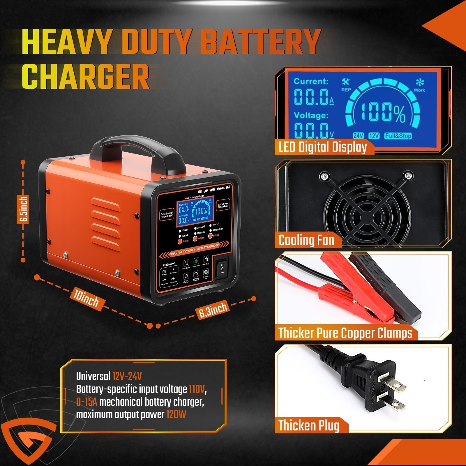 • 12V 24V Car Battery Charger Heavy Duty, 0-15A Automatic Battery Maintainer US