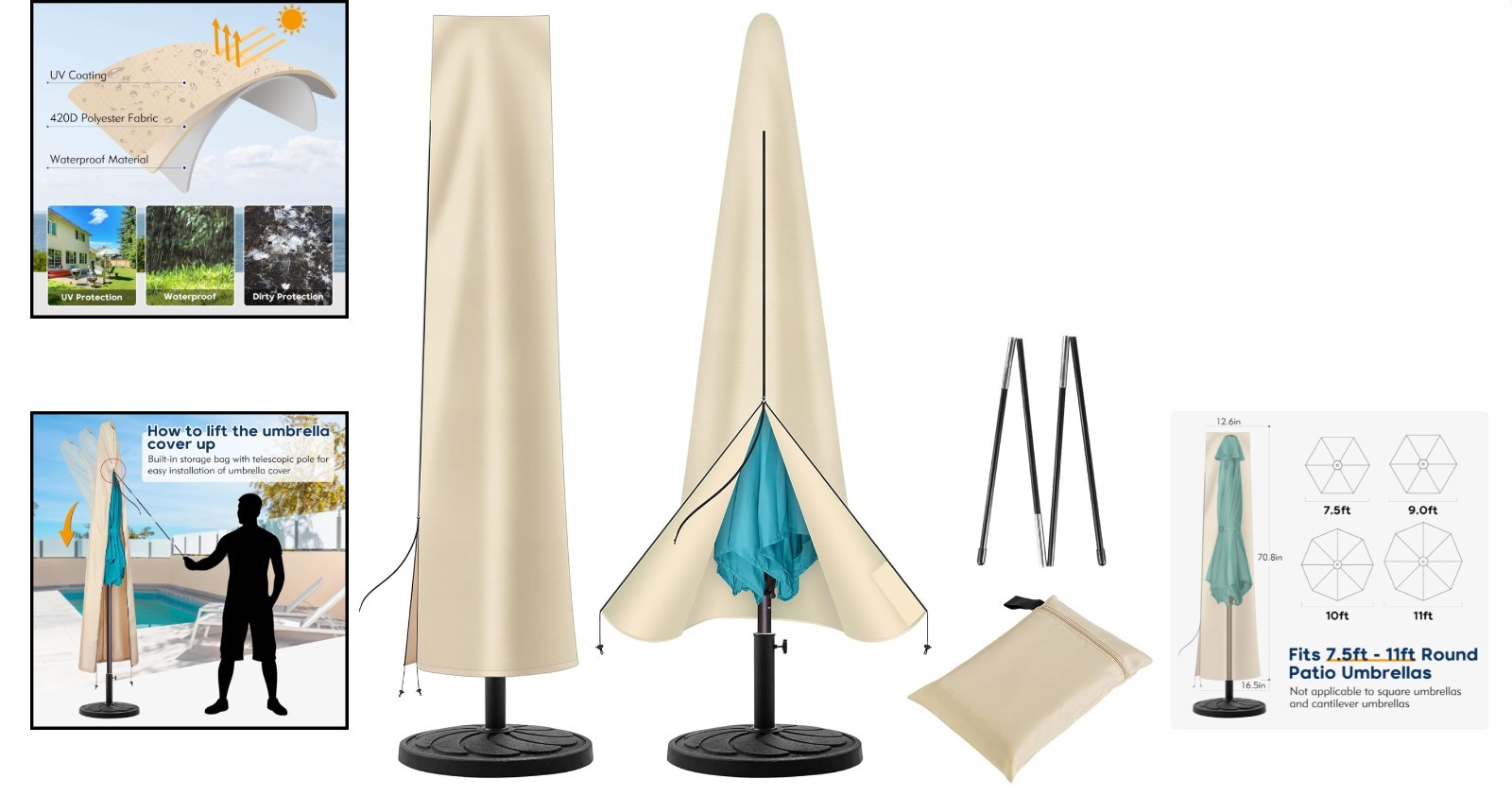Versatile Waterproof Umbrella Cover with Folding Rod for 7.5ft to 11ft Patio