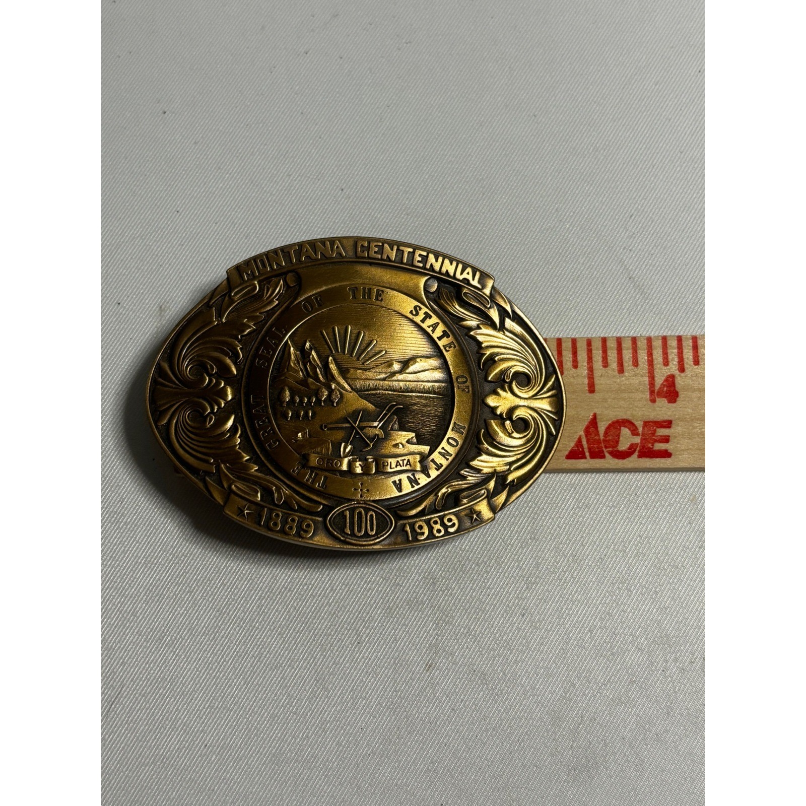 как выглядит Vintage 1889-1989 Montana Centennial Solid Brass Belt Buckle 2296 of 5000 фото