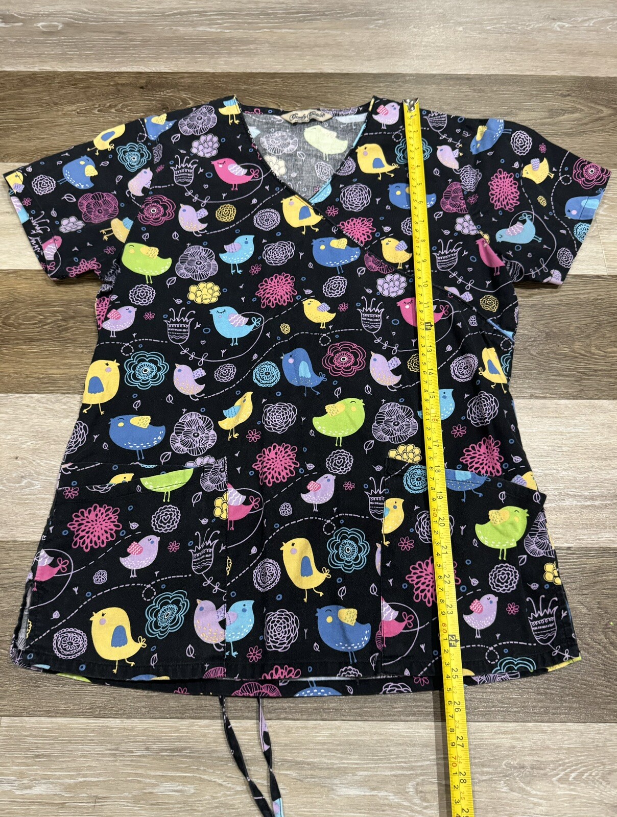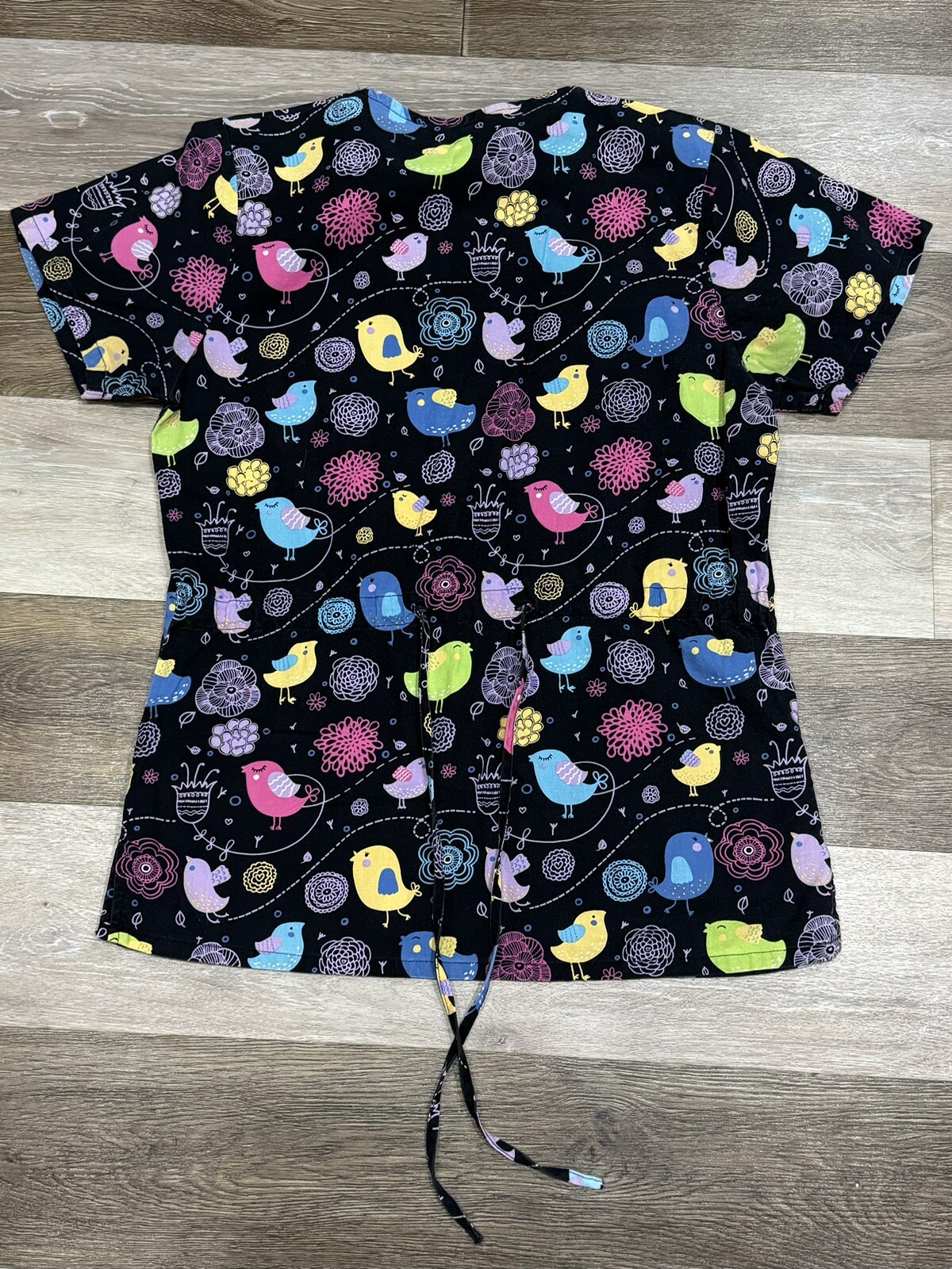 Comfy Cotton Scrub Top Black w/Colorful Birds Measures Size Small Tag Removed