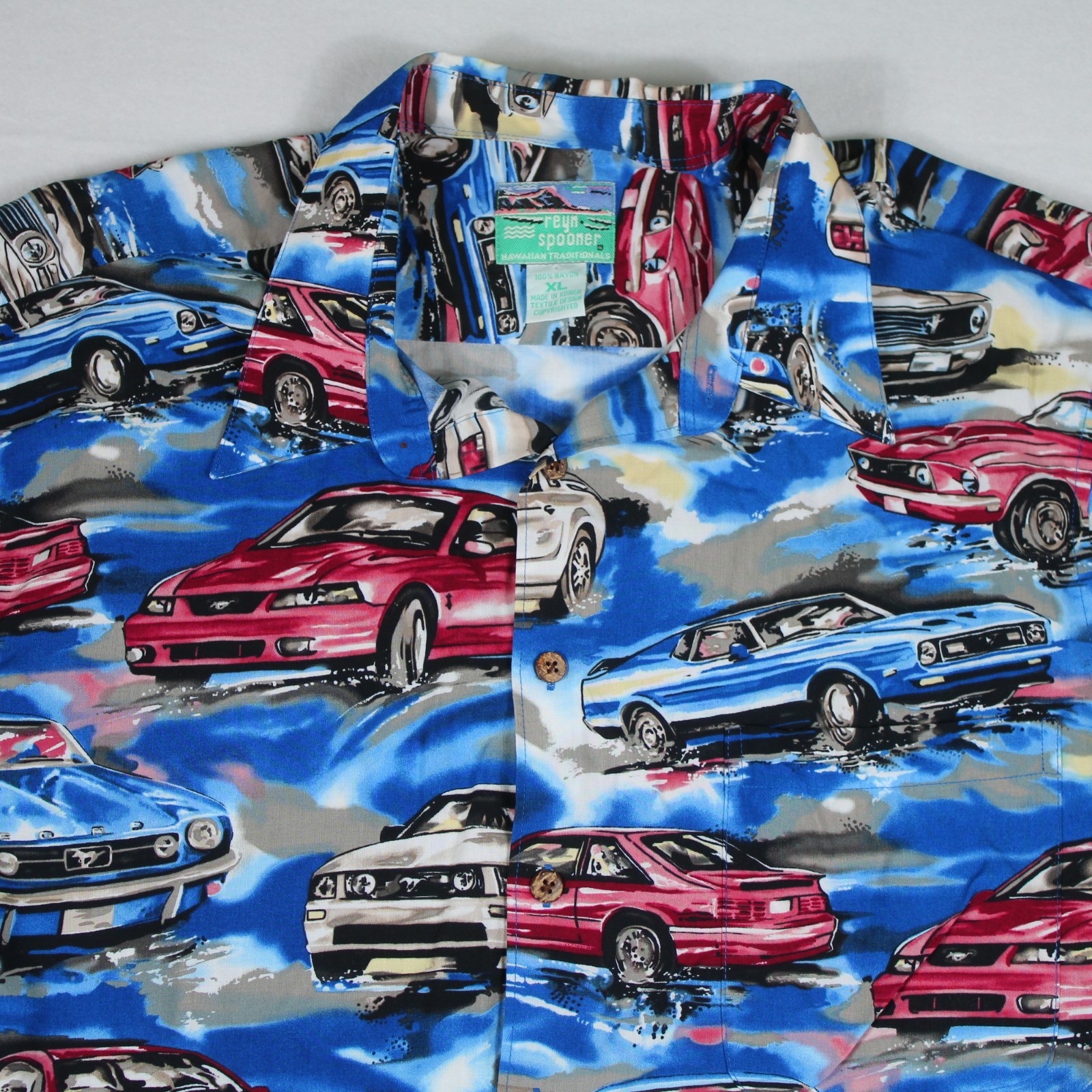 REYN SPOONER Vtg Ford Mustang Classic Cars Blue Hawaiian Aloha Rayon SHIRT XL