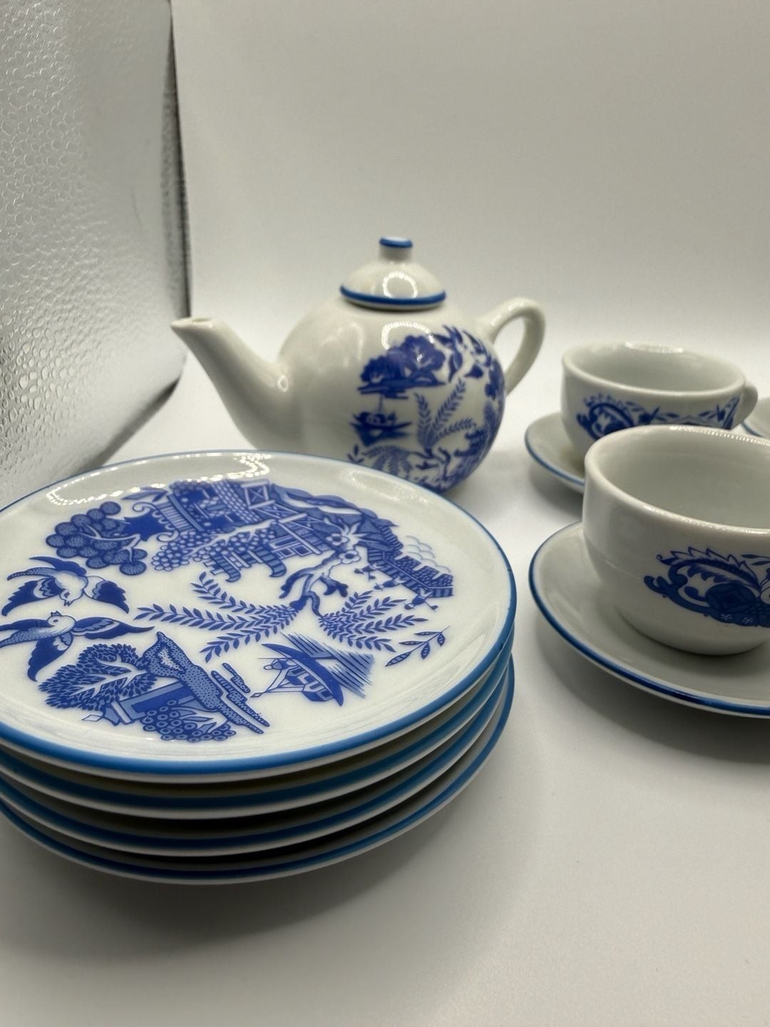 Vintage Miniature Blue Willow Ceramic Child's Tea Set, 16 Pieces