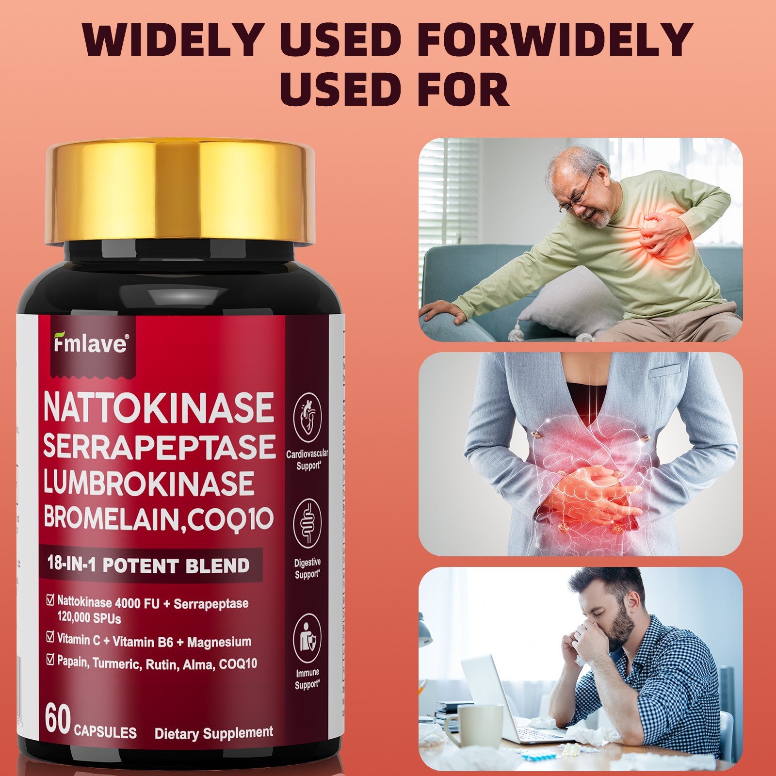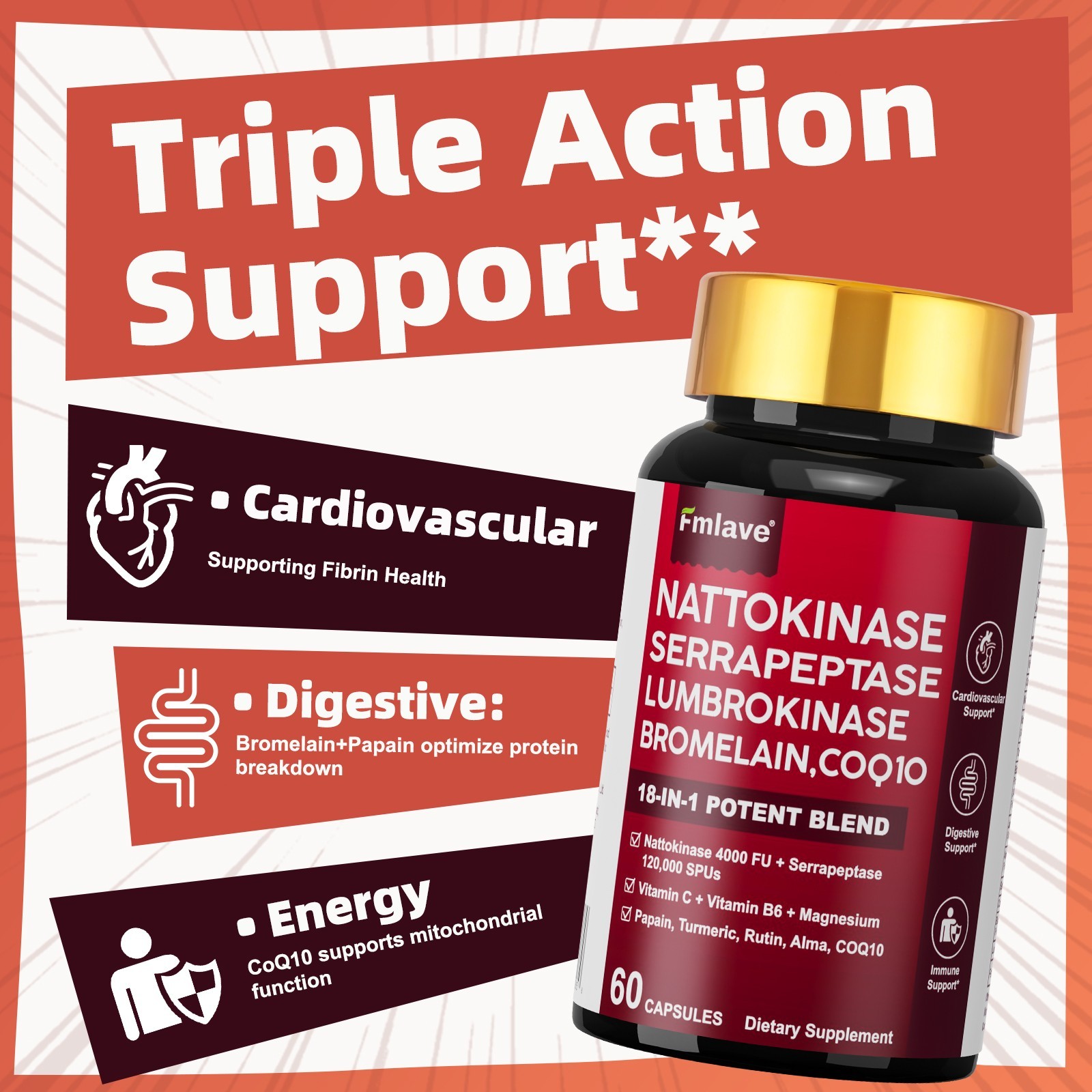 Active Ingredients: Coenzyme Q10/Ubiquinone, CoQ10, Serrapeptase, Turmeric, Nattokinase, Lumbrokinase