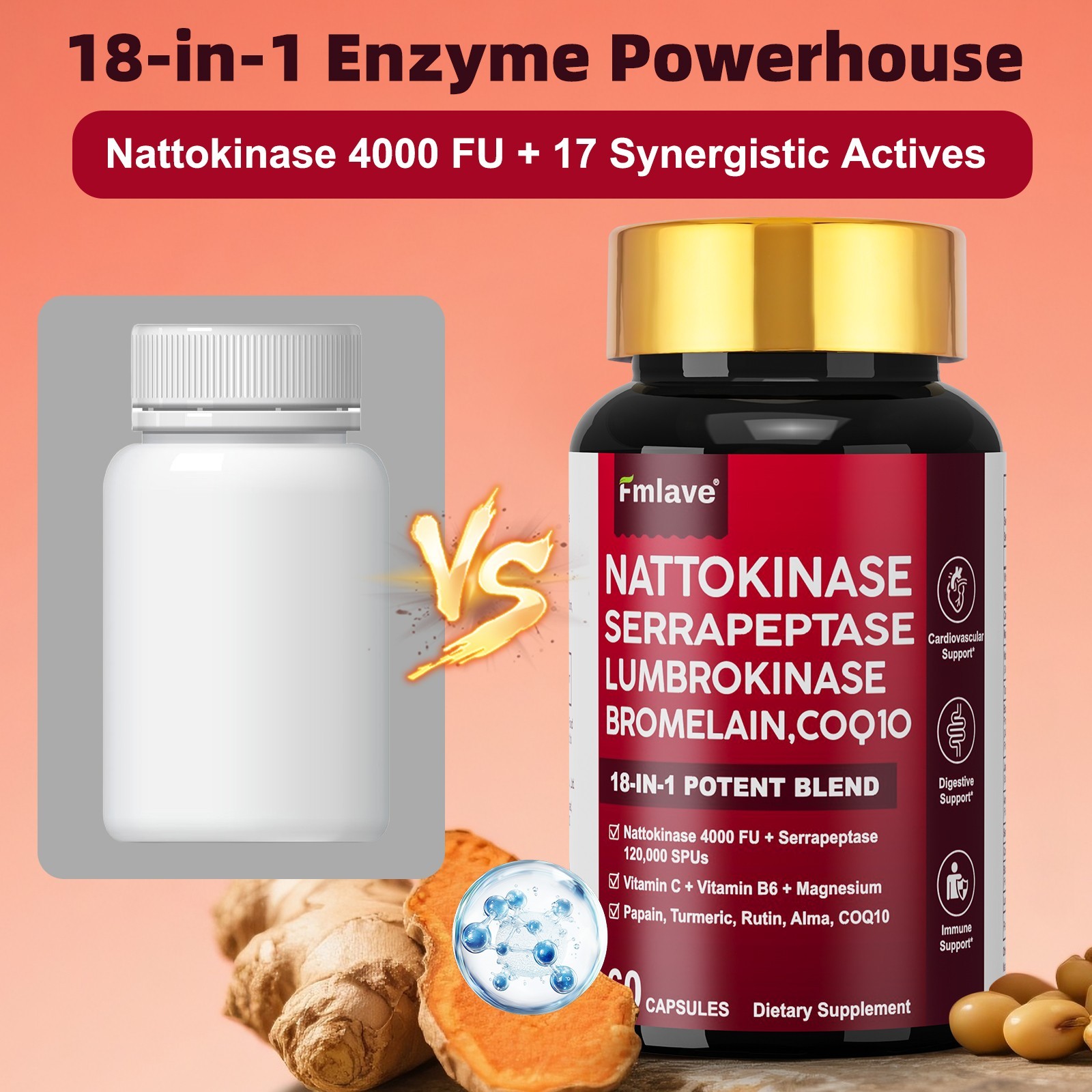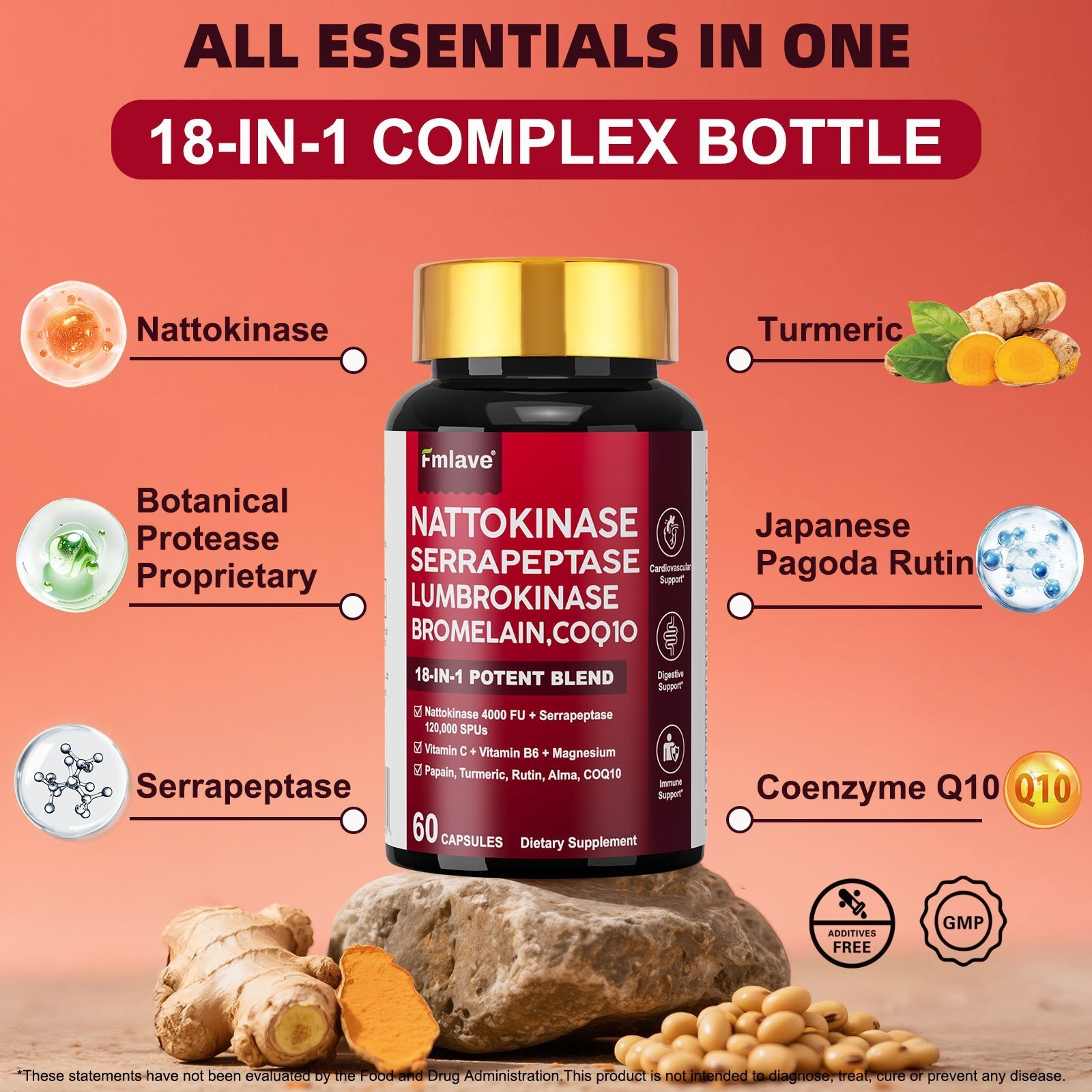 Ingredients: Coenzyme Q10 / Ubiquinone, Serrapeptase, Turmeric, CoQ10, Nattokinase, Lumbrokinase