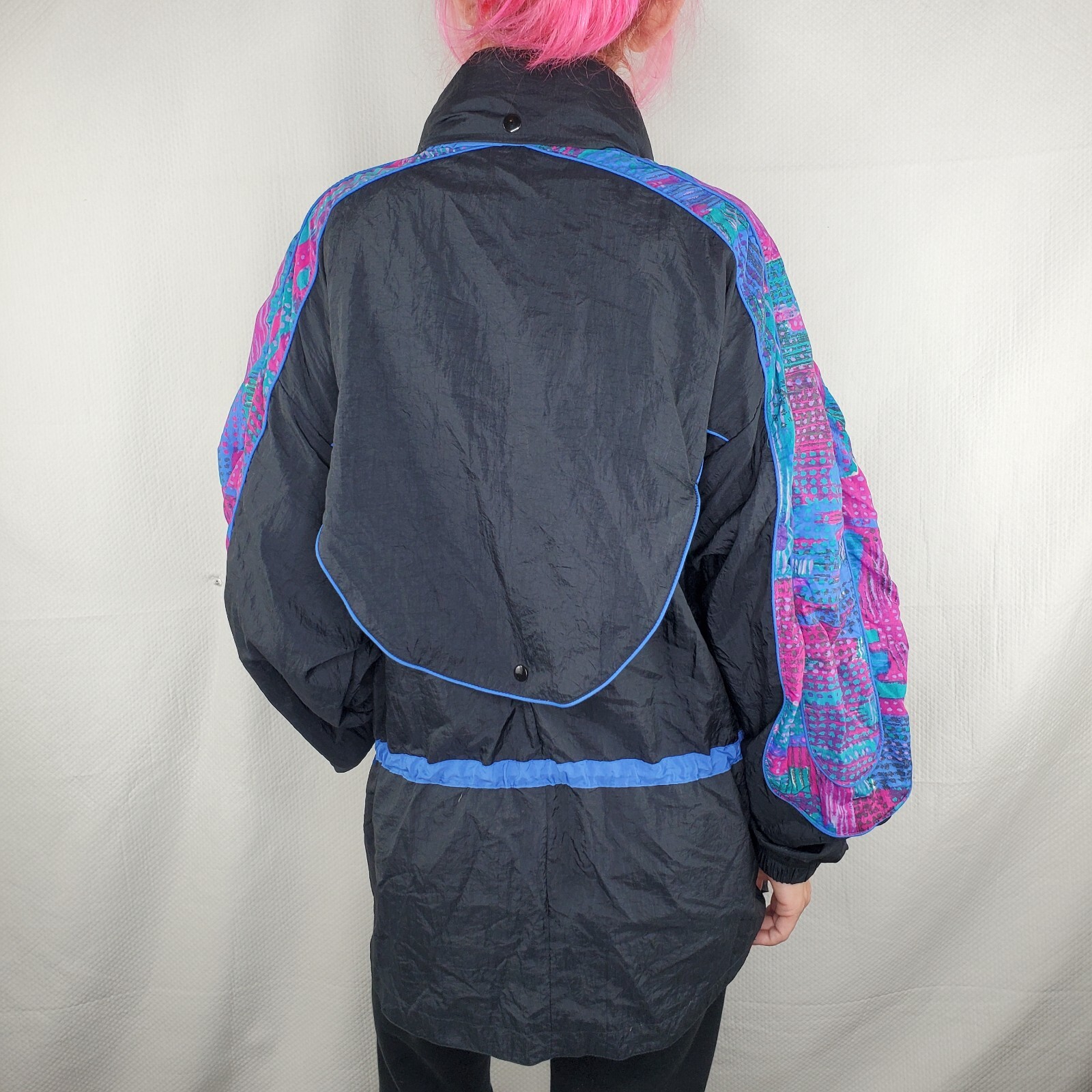 как выглядит VTG 80s Reebok Windbreaker Jacket Zip Drawstring Colorful Print on Black Medium фото