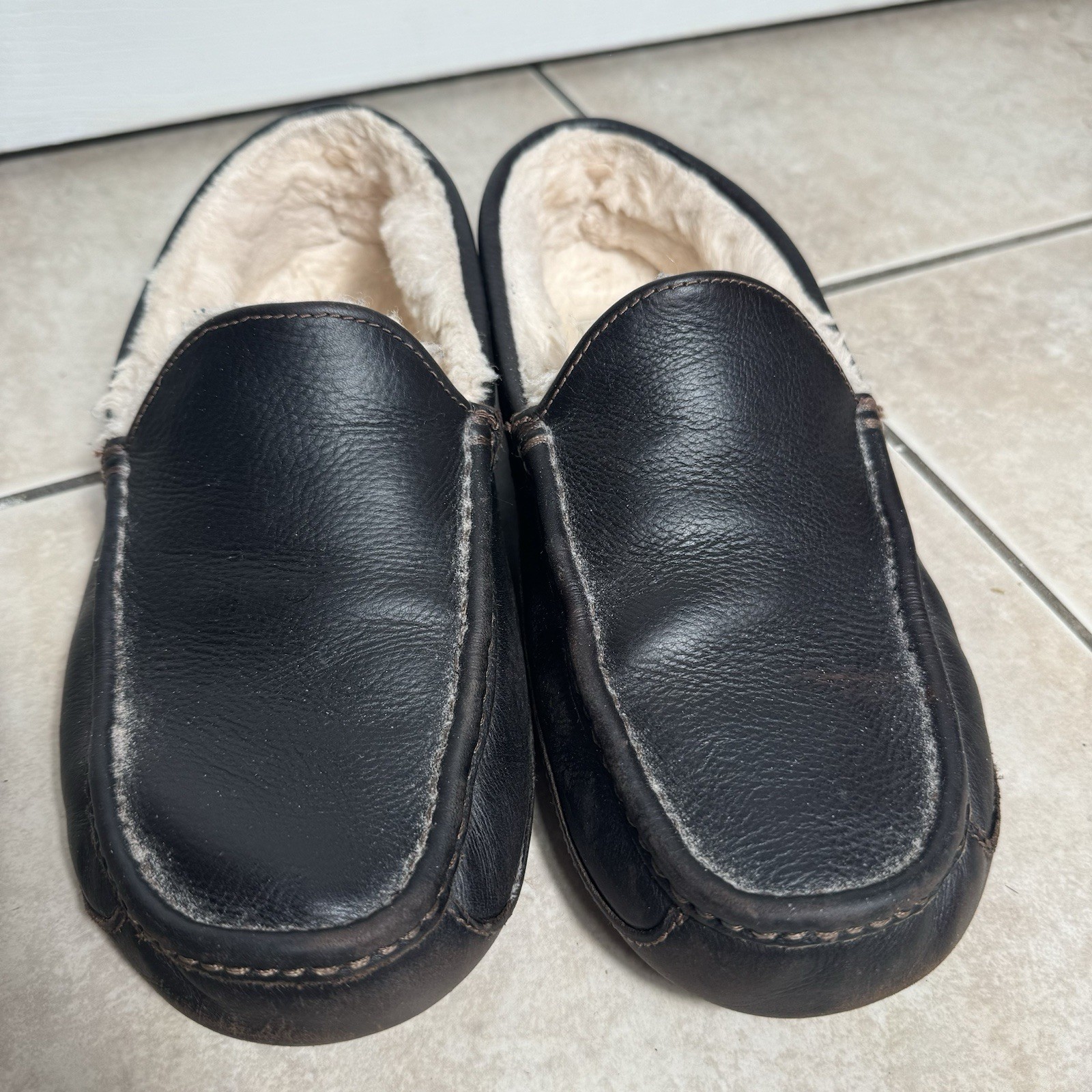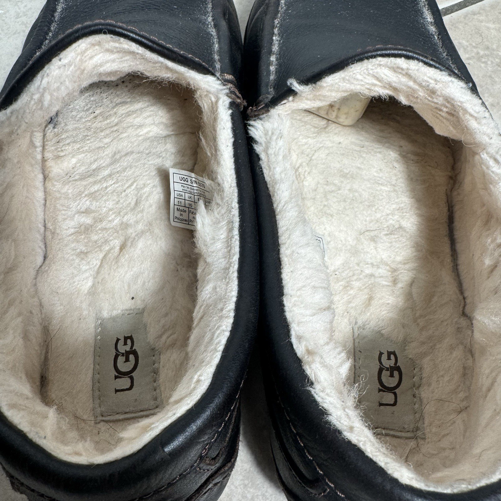 как выглядит UGG Mens 11 Ascot Dark Brown Leather Shearling-Lined Moccasin Slippers фото