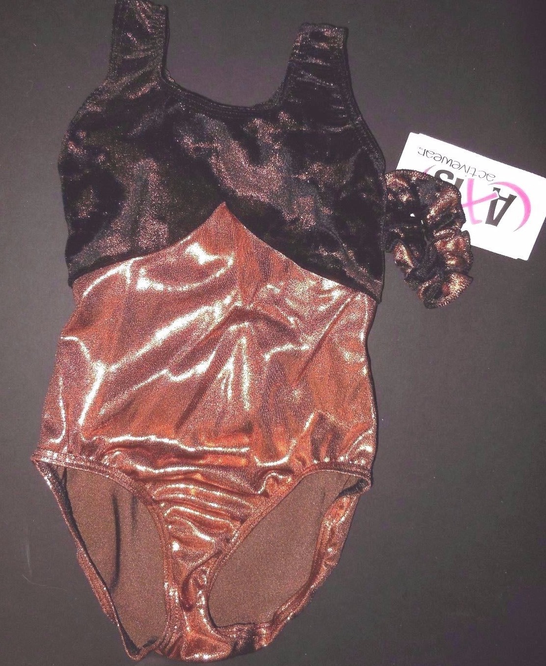 как выглядит NWT Gymnastic leotard Copper Foil chocolate velvet bodice gold foiling twistybck фото