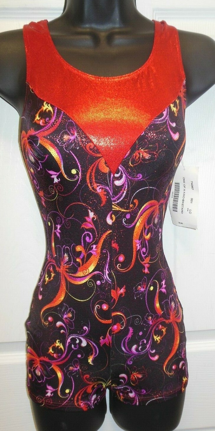 Red Foil Print Spandex Shorty unitard Ch/Adult sizes Red Acro Gymnastics Dance