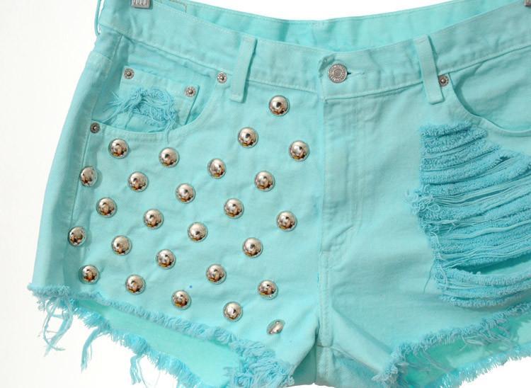 Vtg LEVIS High Waist Pastel Turquoise Dyed STUDDED Destroyed Cut Off Shorts XL