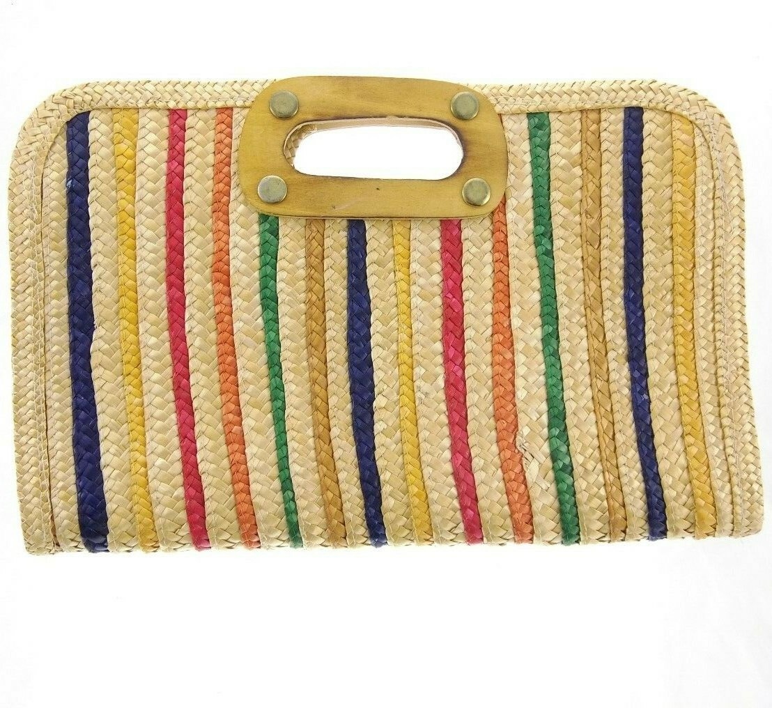 13 Holiday Fair Vintage Rainbow Striped Woven Straw Clutch Purse Natural Weave