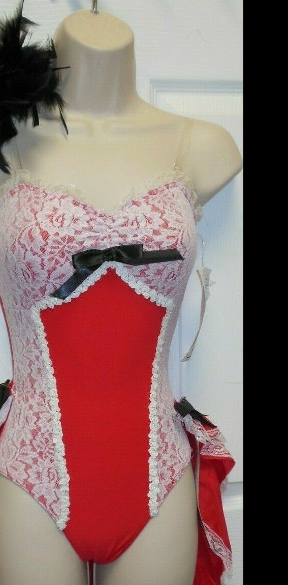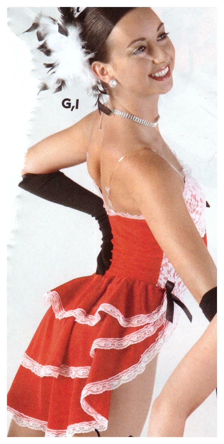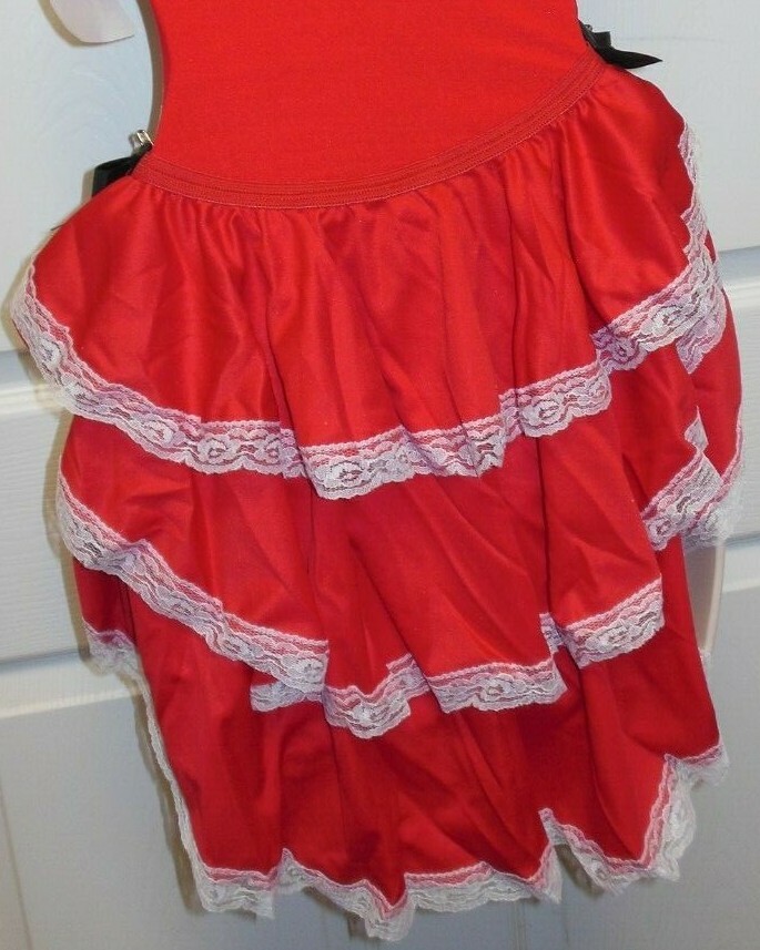 Red White lace trimmed dance costume Leotard w/Backskirt clear adjstbl straps